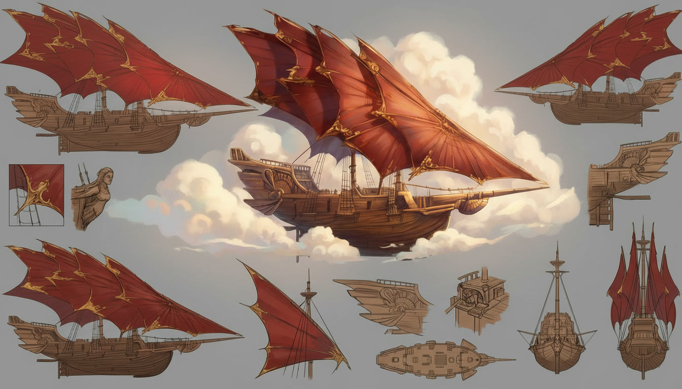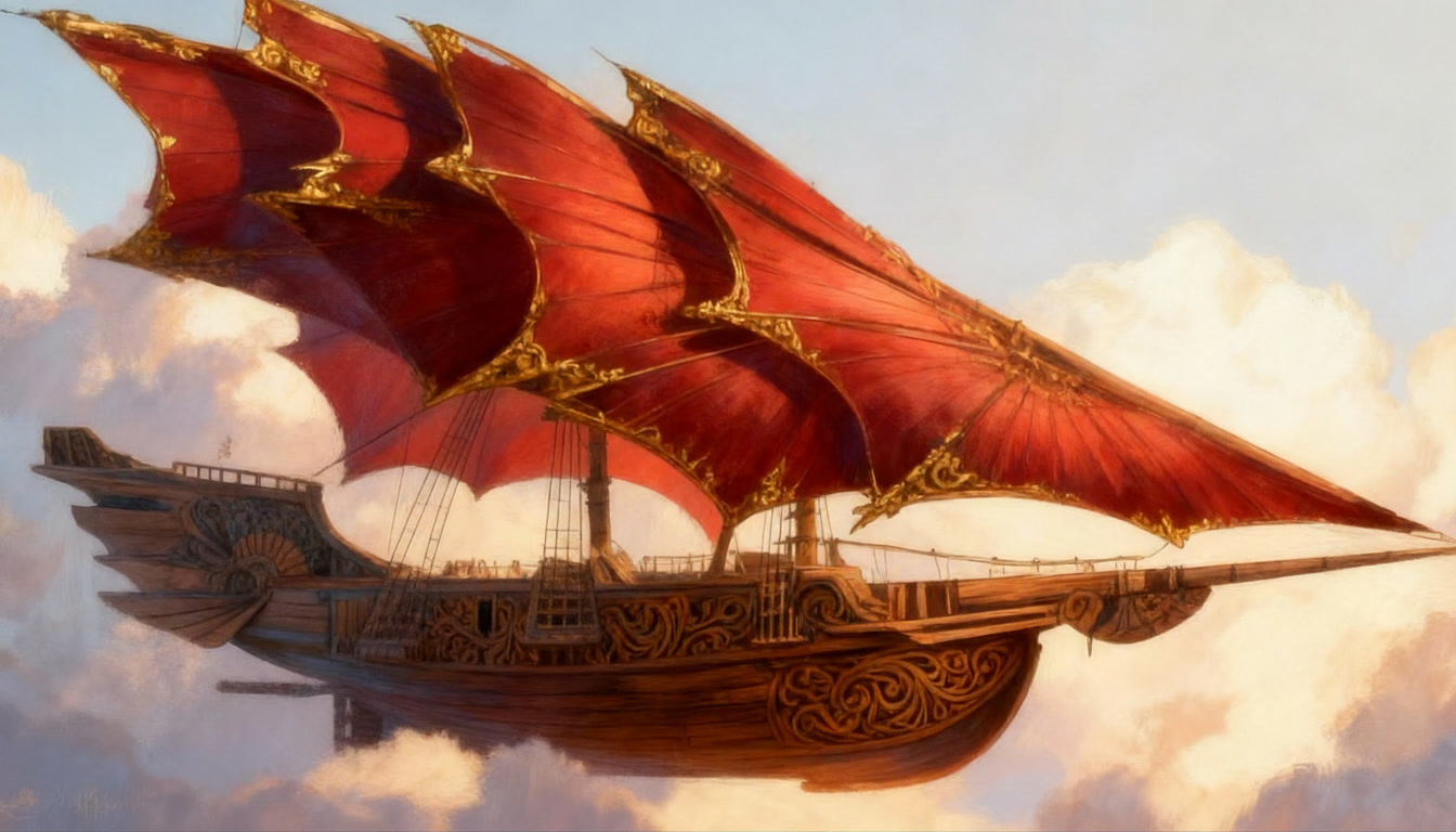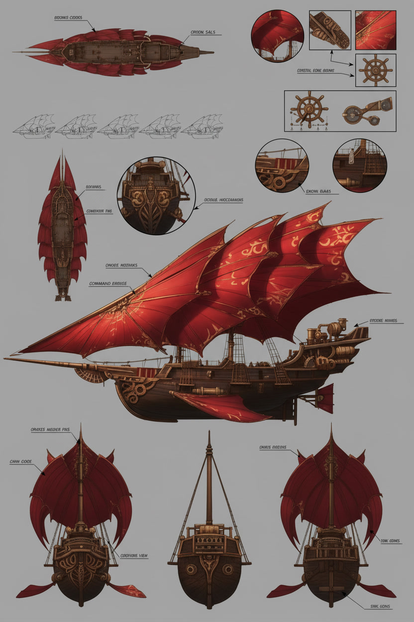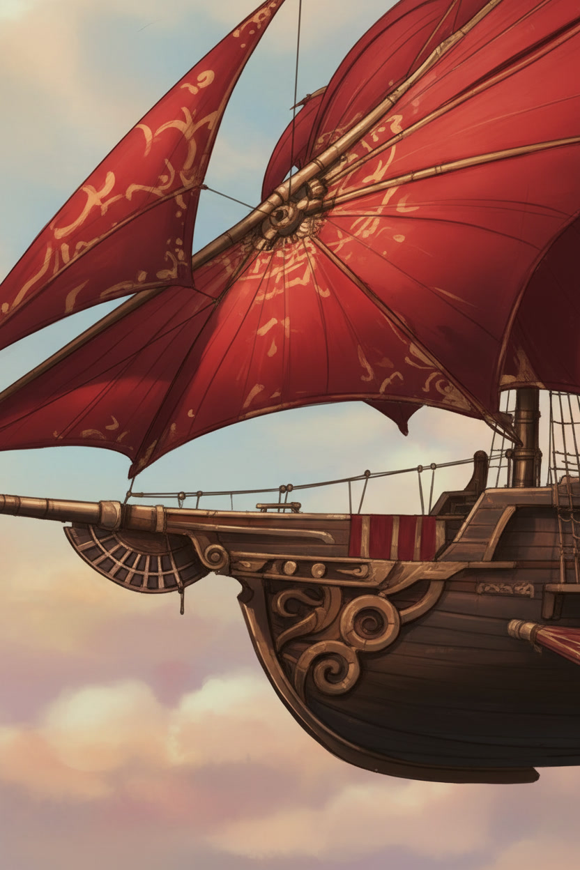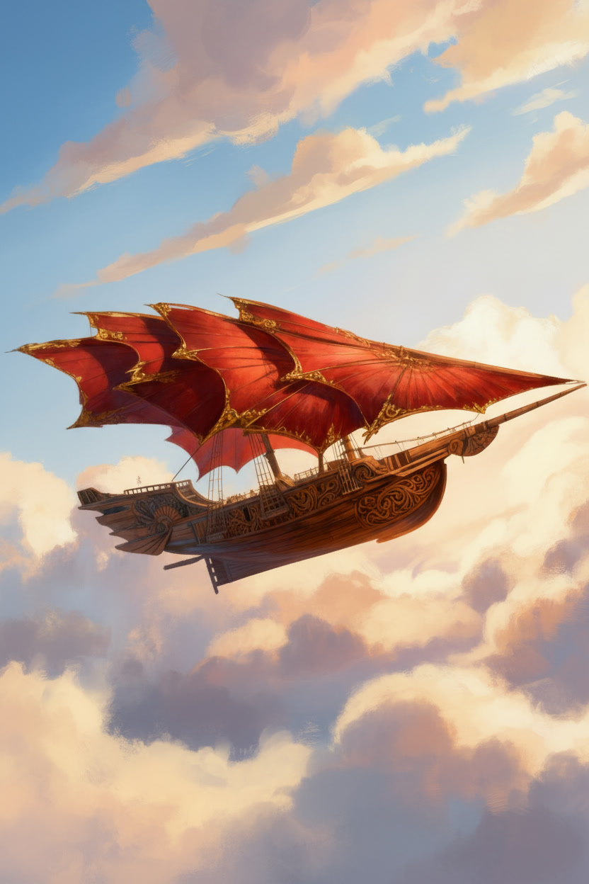 The Stormrider moves through the world on sails that do not belong to any craft made on Aerith. The Solar Wind Void Sails were shaped in the Kasheal shipyards by artisans who understood how to draw strength from the arcane currents that move between stars and worlds. These sails do not wait for wind nor do they strain against it. They gather the quiet pressure of the Weave that surrounds all things and turn that pressure into motion. The ship rises or falls on that pull without a sound. When the sails unfurl across the spine of the vessel their curved surfaces shimmer with a faint ripple that never appears in ordinary cloth. That ripple is the sign that the sails have begun to feel the arcane current around them. The ship does not need commands at that stage. The act of opening the sails is enough to let the first breath of movement settle into the hull. The Stormrider glides forward with the same ease as a leaf drifting across still water. Once the helm engages the motion changes shape. A spellcaster seated at the helm can feel the pressure gathered by the sails the way a swimmer feels the tension of a strong tide. They do not force the ship to move. They guide the stream of force that the sails are already drawing in. A gentle thought will tilt the ship to starboard. A sharper thought will send it climbing. Every shift in the helm creates a matching shift in the sails and the result is immediate. In the open sky the Stormrider moves with a speed that feels unnatural to sailors who grew up on the lumbering sky barges of Aerith. The Solar Wind Void Sails catch currents that ordinary vessels cannot reach. The hull cuts through those currents with the same confidence it shows on water. Even without wind the ship can race across the horizon faster than any craft built by the Church Kingdoms or the coastal yards. It outruns storms. It leaves patrols behind without effort. When the Stormrider flies above cloud banks the sails draw strength from the thin bright air where the Weave flows more freely. The ship becomes lighter and more responsive. A single tilt of the helm can change its entire angle. The deck remains steady despite the speed because the force pulling the ship forward is evenly distributed across the curved sails. The crew feel only a steady rise in their stomachs as the vessel climbs. Near the surface of the sea the sails react differently. They gather less arcane current but the shape of the vessel allows the ship to lean into the water. It moves like a fast cutter rather than a sky craft. The curved hull pierces waves without resistance and the ship slides through the surf with the quiet grace of a hunting creature. The lack of wind does not slow it. The sails continue to drink in the arcane flow and the helm continues to shape it. During dangerous maneuvers the Stormrider becomes something closer to a living thing. The sails tighten along their upper arcs as if bracing against an unseen force. The helm responds with the speed of instinct. The ship can turn sharply enough to make the horizon swing like a door. It can skim low over the sea before rising straight into the air as if pulled by a rope. These movements would rip an ordinary vessel apart. The Stormrider accepts them without complaint. The propulsion of the Stormrider has confused shipwrights on Aerith since the first time they saw it land. They search the hull for runes or mechanical devices. They tap the wood for hidden chambers. They examine the seams for engines. They find nothing because there is nothing to find. The motion comes entirely from the sails and the helm. Everything else aboard the ship is ordinary craftwork and simple construction. Even while docked the propulsion system remains quietly active. The sails folded above the deck continue to absorb faint traces of the arcane flow. The ship feels a low steady pressure beneath its timbers. That pressure does not move the vessel but it keeps the helm ready for the next departure. The Stormrider never feels inert. It rests the same way a predator rests with its eyes half open and its weight settled toward the direction of its next leap. When the crew prepare to depart the ship responds before any command is spoken. The sails give a soft ripple. The hull gives a quiet shift. The air around the deck feels lighter. These signs mark the moment when the Stormrider remembers what it was built to do. It was shaped for speed and escape. It was shaped to cross the sky with the ease of a thrown blade. The moment the helm touches the gathered flow of the sails the ship moves like it has been waiting to breathe again.