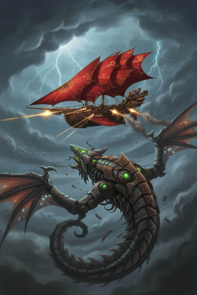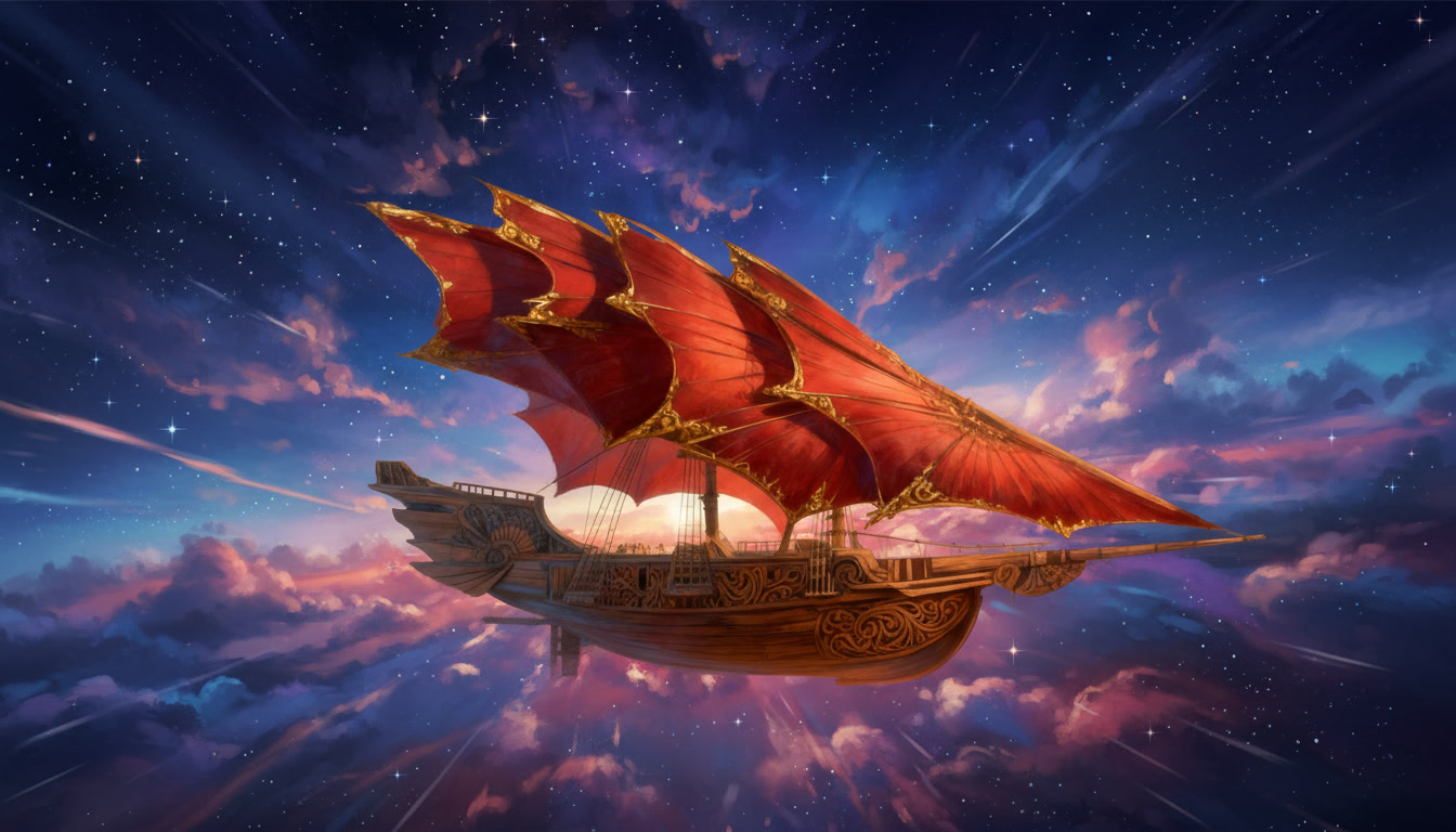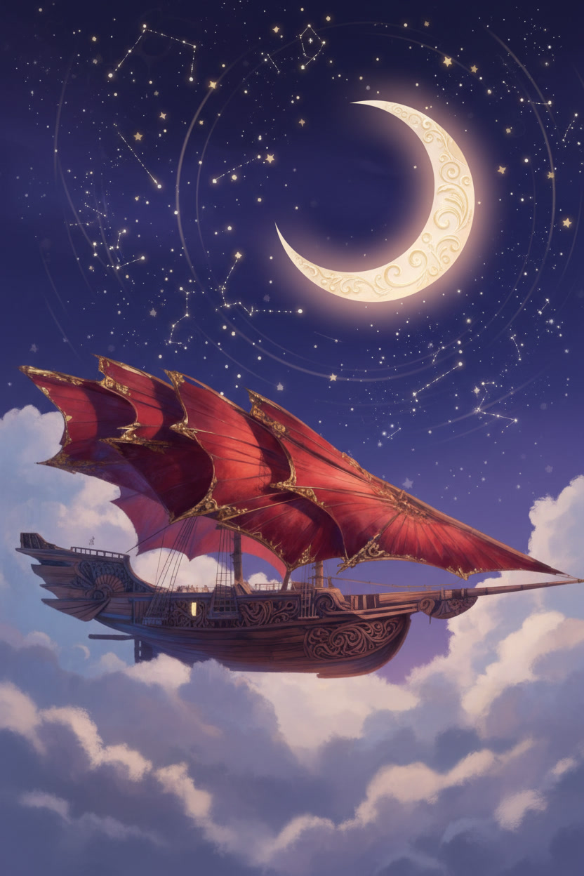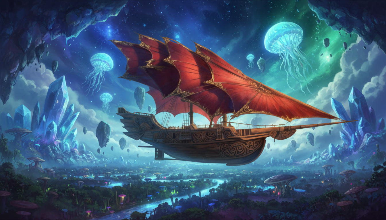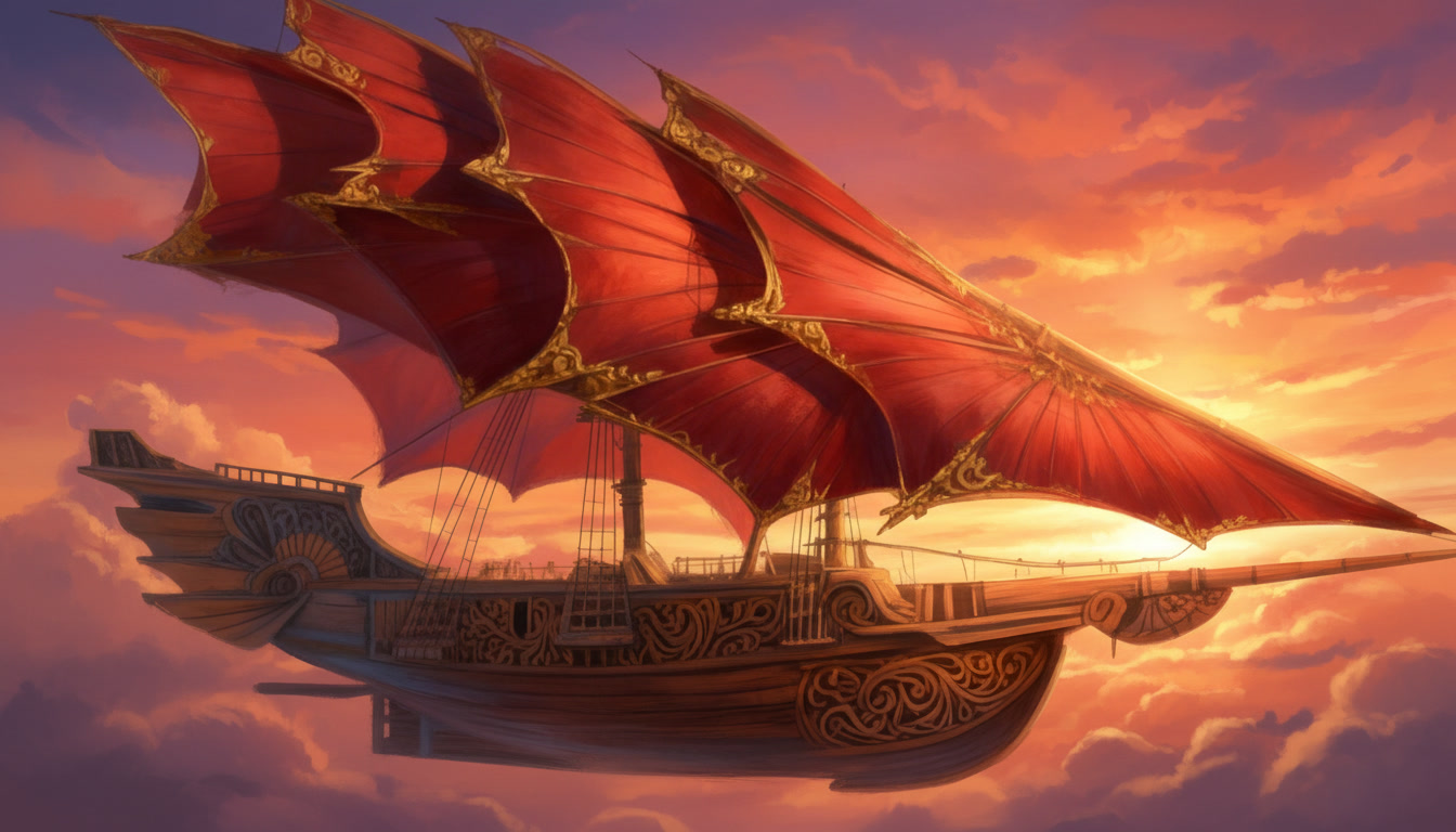 The Stormrider moves through the world on sails that do not belong to any craft made on Aerith. The Solar Wind Void Sails were shaped in the Kasheal shipyards by artisans who understood how to draw strength from the arcane currents that move between stars and worlds. These sails do not wait for wind nor do they strain against it. They gather the quiet pressure of the Weave that surrounds all things and turn that pressure into motion. The ship rises or falls on that pull without a sound. When the sails unfurl across the spine of the vessel their curved surfaces shimmer with a faint ripple that never appears in ordinary cloth. That ripple is the sign that the sails have begun to feel the arcane current around them. The ship does not need commands at that stage. The act of opening the sails is enough to let the first breath of movement settle into the hull. The Stormrider glides forward with the same ease as a leaf drifting across still water. Once the helm engages the motion changes shape. A spellcaster seated at the helm can feel the pressure gathered by the sails the way a swimmer feels the tension of a strong tide. They do not force the ship to move. They guide the stream of force that the sails are already drawing in. A gentle thought will tilt the ship to starboard. A sharper thought will send it climbing. Every shift in the helm creates a matching shift in the sails and the result is immediate. In the open sky the Stormrider moves with a speed that feels unnatural to sailors who grew up on the lumbering sky barges of Aerith. The Solar Wind Void Sails catch currents that ordinary vessels cannot reach. The hull cuts through those currents with the same confidence it shows on water. Even without wind the ship can race across the horizon faster than any craft built by the Church Kingdoms or the coastal yards. It outruns storms. It leaves patrols behind without effort. When the Stormrider flies above cloud banks the sails draw strength from the thin bright air where the Weave flows more freely. The ship becomes lighter and more responsive. A single tilt of the helm can change its entire angle. The deck remains steady despite the speed because the force pulling the ship forward is evenly distributed across the curved sails. The crew feel only a steady rise in their stomachs as the vessel climbs. Near the surface of the sea the sails react differently. They gather less arcane current but the shape of the vessel allows the ship to lean into the water. It moves like a fast cutter rather than a sky craft. The curved hull pierces waves without resistance and the ship slides through the surf with the quiet grace of a hunting creature. The lack of wind does not slow it. The sails continue to drink in the arcane flow and the helm continues to shape it. During dangerous maneuvers the Stormrider becomes something closer to a living thing. The sails tighten along their upper arcs as if bracing against an unseen force. The helm responds with the speed of instinct. The ship can turn sharply enough to make the horizon swing like a door. It can skim low over the sea before rising straight into the air as if pulled by a rope. These movements would rip an ordinary vessel apart. The Stormrider accepts them without complaint. The propulsion of the Stormrider has confused shipwrights on Aerith since the first time they saw it land. They search the hull for runes or mechanical devices. They tap the wood for hidden chambers. They examine the seams for engines. They find nothing because there is nothing to find. The motion comes entirely from the sails and the helm. Everything else aboard the ship is ordinary craftwork and simple construction. Even while docked the propulsion system remains quietly active. The sails folded above the deck continue to absorb faint traces of the arcane flow. The ship feels a low steady pressure beneath its timbers. That pressure does not move the vessel but it keeps the helm ready for the next departure. The Stormrider never feels inert. It rests the same way a predator rests with its eyes half open and its weight settled toward the direction of its next leap. When the crew prepare to depart the ship responds before any command is spoken. The sails give a soft ripple. The hull gives a quiet shift. The air around the deck feels lighter. These signs mark the moment when the Stormrider remembers what it was built to do. It was shaped for speed and escape. It was shaped to cross the sky with the ease of a thrown blade. The moment the helm touches the gathered flow of the sails the ship moves like it has been waiting to breathe again.