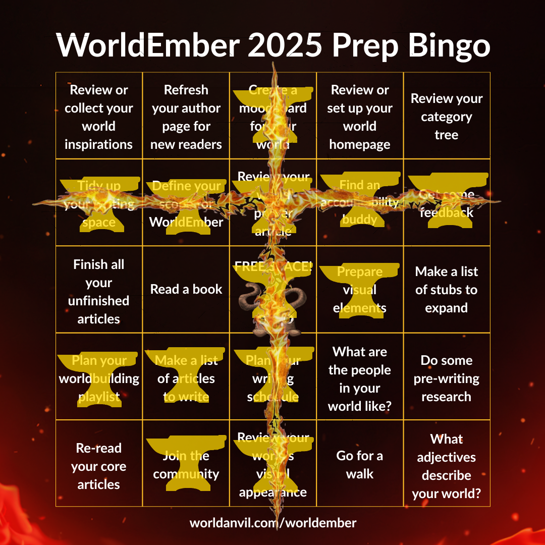 I have Google Sheets lists of articles to potentially write for both worlds, which I have found easier for me to curate than in-WA to-do lists if the articles are only potential ideas rather than for-sure concepts. I plan on transferring ideas to the to-do lists provided by World Anvil as I work, although we'll see if that proves to be helpful to my work process this WorldEmber.