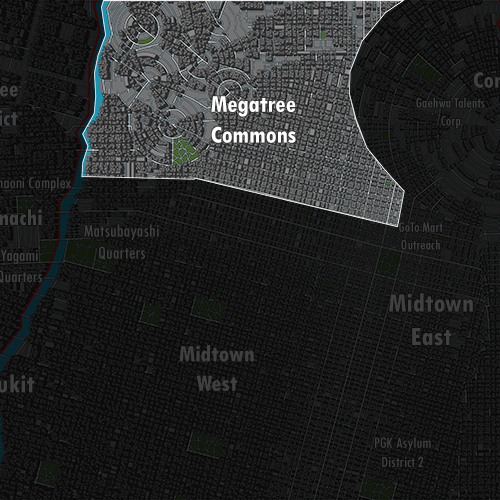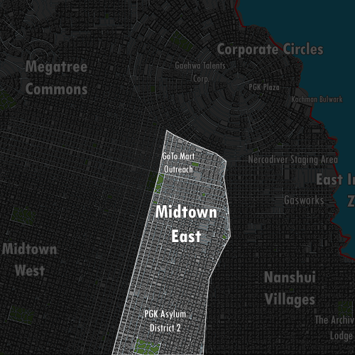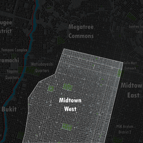 Midtown was the first location outside of the original settlement area that was created to be the residential and commercial zones for the quickly growing population after PGK ended isolation of Project Acropolis. Midtown continues to be not only the largest district in New Singapore, but is also the most populated of all the other districts. Typically Midtown is split into an East and West section, with the West and Newest side populated almost entirely by registered citizens of New Singapore.