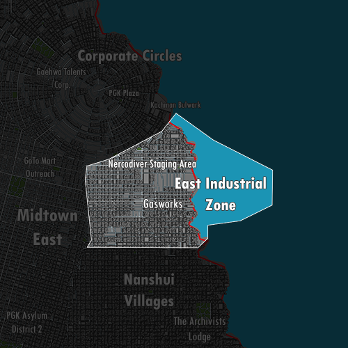 Though called the "East" Industrial Zone, there exists no other industrial zone in any other cardinal direction, with the only other zone repurposed as the refugee district. All heavy industry originating in New Singapore lays within the western side of the district, with the eastern seafront side filled with warehouses of various sizes and ownership. PGK owns the largest share of the factories, a large area known as the "Gasworks" now a nick name for the entire industrial area. Deliveries are done via VTOL (Vertical Take-off and Landing) vehicles, so the actually alleys and streets of the Gasworks are notoriously known for being very unsafe and unregulated and the company tends not to use it. Those who struggle to live in the refugee district tend to get lost here and never return.