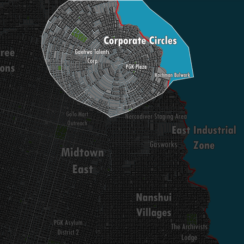 The site of the original Project Acropolis's corporate headquarters and settlement, the original area has grown to a large city center consisting of concentric circles of numerous skyscrapers which house the corporate headquarters of Parker, Goto, and Kochmann Inc., their subsidiaries, and other smaller corporate entities. Considered the crown jewel of PGK and New Singapore, the Corporate Circles are the safest and most technologically advanced area in the entire world, a true shadow of The Old World.