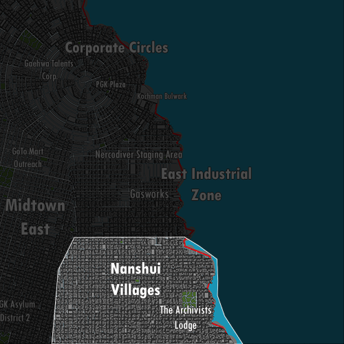 At the North end of the district is the Necrodiver Staging Area, operated by the Necrodivers Union as a staging point for Necrodiver operations in what they call the East Asian and SEA Theaters. While mostly covered in tarmac where drill rigs are stationed alongside their VTOL Frames, apartments and bars are also around the area as well to support members.