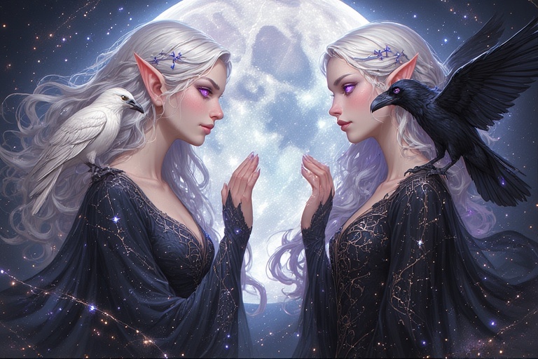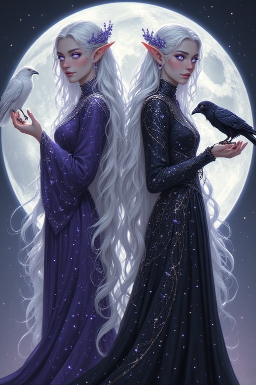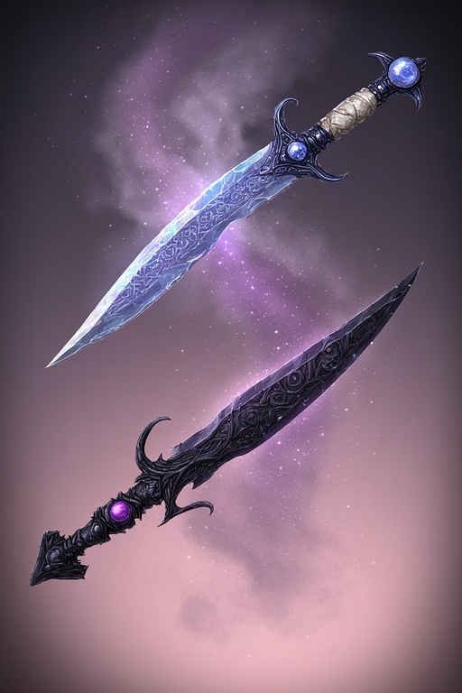 The twin blades thrum, their silver luminescence mirroring the celestial tapestry above. Stars, impossibly sharp and clear, seemed to swim within the polished steel, their silent dance perfectly synchronized with the heavens. Then, as if on cue, a raven's mournful cry pierced the night, a somber echo that seemed to bind the blades, the sky, and the very air into a single, potent omen.