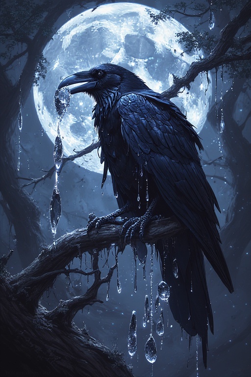 The Raven is Eiryalth's sacred animal, a creature that embodies the profound mysteries of her domains. With its glossy, midnight-hued plumage that seems to absorb the very darkness of night, and its keen, intelligent eyes that hold the ancient wisdom of the veiled paths, the raven is a perfect emissary of the Nightmother. It represents the silent passage of death, the watchful presence of the moon in the deepest hours, and the hidden resilience of life that thrives unseen. Its caw, often heard in the quietest moments, is a reminder of secrets held, of transitions observed, and of the cyclical nature of existence—from the deepest night to the first hint of dawn. The raven, in its solitary flight and its connection to omens and hidden knowledge, mirrors Eiryalth's role as a guardian of the liminal spaces between worlds and states of being.