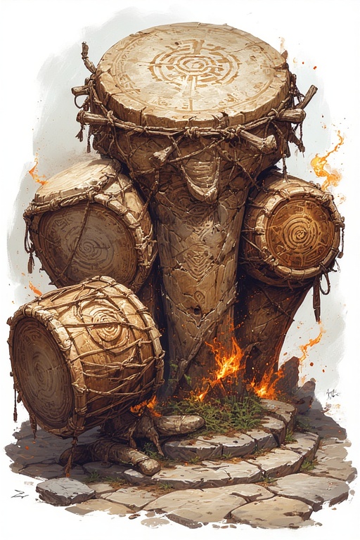 Providing the rhythmic heart of the dance are the Bone-Caller Drums. These are not ordinary instruments; they are specifically crafted drums, often made from hollowed bone or stretched hide from sacred animals, designed to resonate with a deep, primal frequency. Their thunderous beat vibrates through the very stone of the ancestral altar, acting as both a powerful anchor for the dancers and a sonic invocation that calls to the departed, urging their spirit toward freedom.