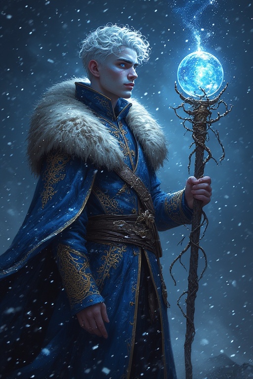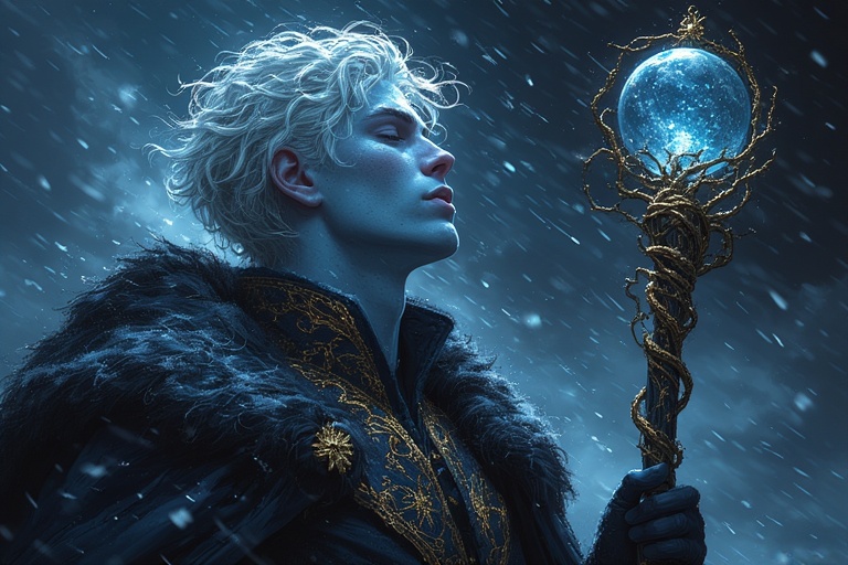 Oneiroi, the Slumbering Archon, does not walk the mortal coil in flesh and bone, yet he resides within the very fabric of our subconscious. He is the Architect of Dreams, the silent snowfall that blankets the mind’s eye, and his presence is felt in the ethereal landscapes we traverse each night. When he chooses to manifest, it is as a fair-featured Ice Gensai, his skin a delicate hue of baby blue, as if kissed by the first frost. His eyes, like polished pewter, hold the depth of a twilight sky, and his white hair, often shot through with streaks of glacial blue, stands in sharp, spiky tufts. He wields a staff, its surface gnarled and twisted like ancient ice, crowned by a snowglobe that glows with a soft, guiding light, a beacon for lost souls adrift in the vast expanse of his domain. His robes, a deep, starlit navy, are trimmed with the warmth of grey furs, their rich texture embroidered with patterns of bronze and pewter, mirroring the celestial tapestry of the dream realm. He is the whisper in the void, the chill that tingles before a revelation, the gentle hand guiding us through the labyrinth of our own slumber.