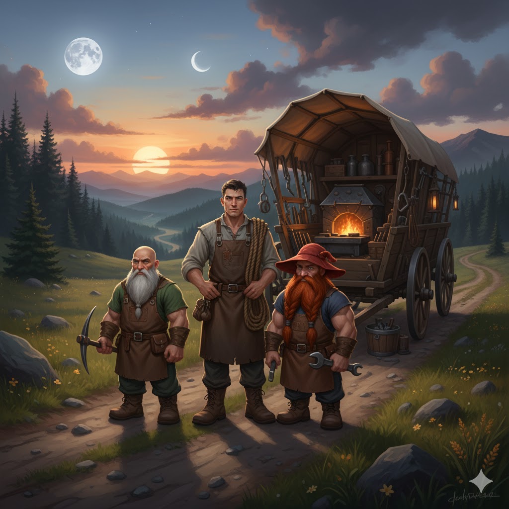 Glorin and Durmi two male dwarves and Harlow a male human are the three drivers that Jerek Stonehand employs in his caravan. All three have been with him for many years. Glorin and Durmi are brothers who are constantly squabbling and needling each other. Harlow is a sturdy fellow who likes to belch after he eats his often prodigious meals.
