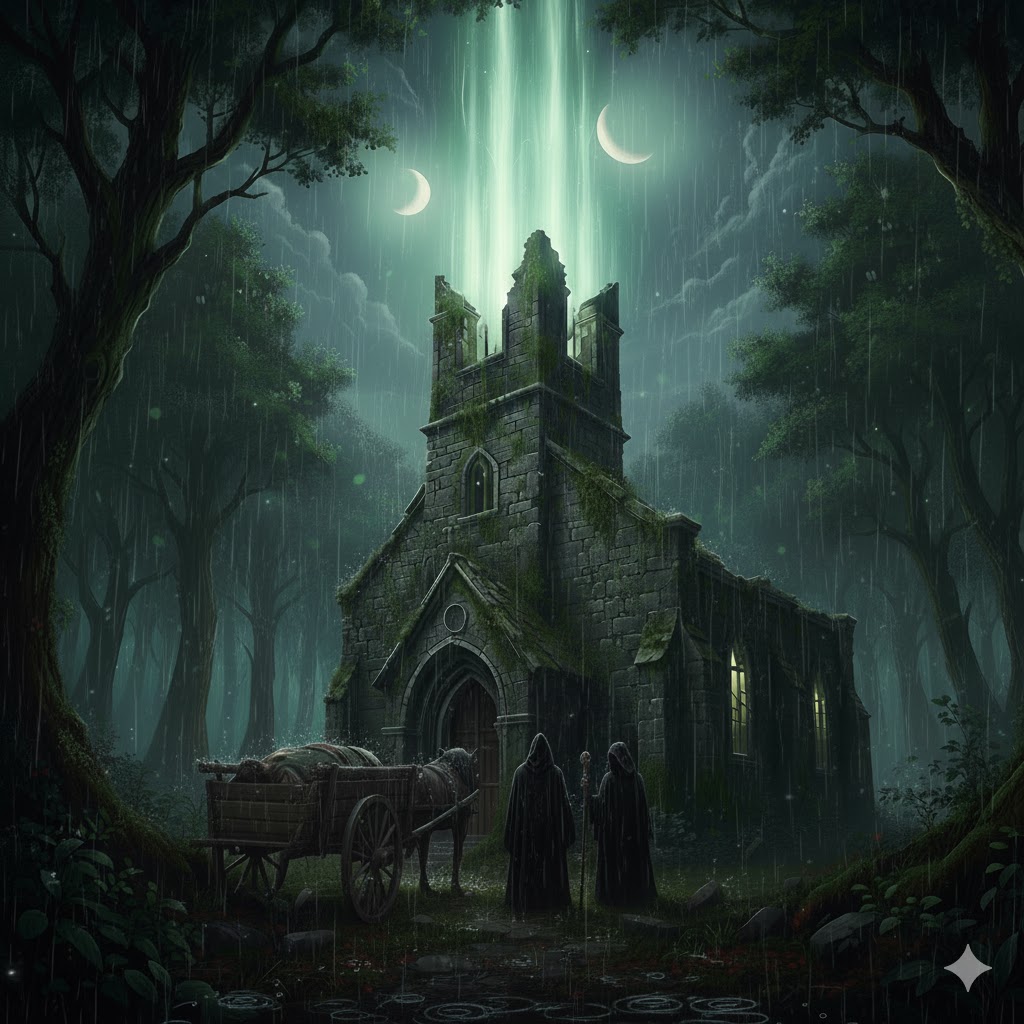 They continued on deeper into the forest as thunder rolled in the distance. Rising above the trees, they could barely make out the belfry of an old stone chapel. The wagon tracks led directly toward it. Creek and Lyra crept forward with Volu and Zodak following at a safe distance.