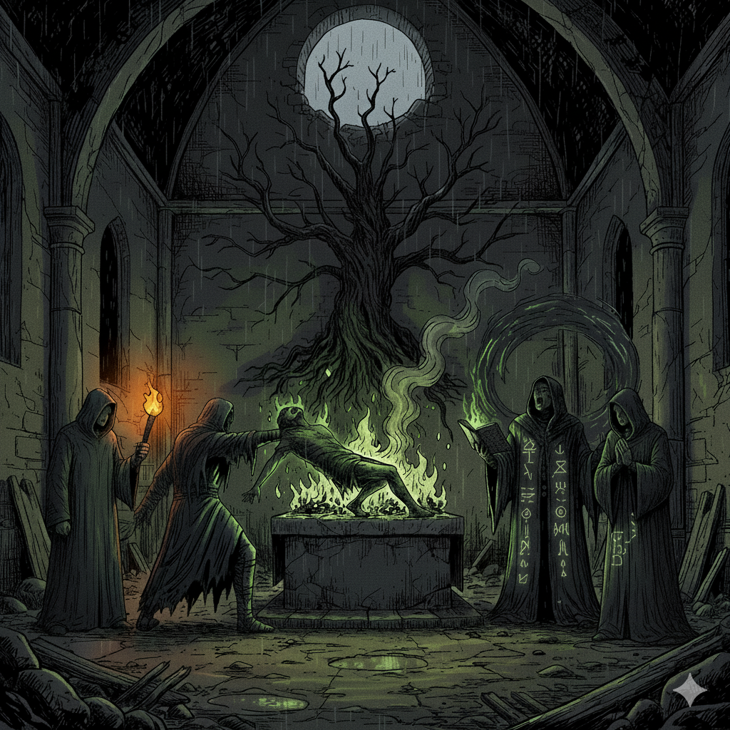 Rushing forward, the heroes burst into the ruined chapel. They saw a crude stone altar directly under the ruined belfry. It was wreathed in a greenish fire. A desiccated tree loomed up out of the darkness at the far end of the nave. A robed figure had just thrown a body onto the altar and the person screamed and writhed in agony. Next to the unholy altar was another man. He was clad in dark robes that were covered in runes. He was reciting the words of some sort of ritual.