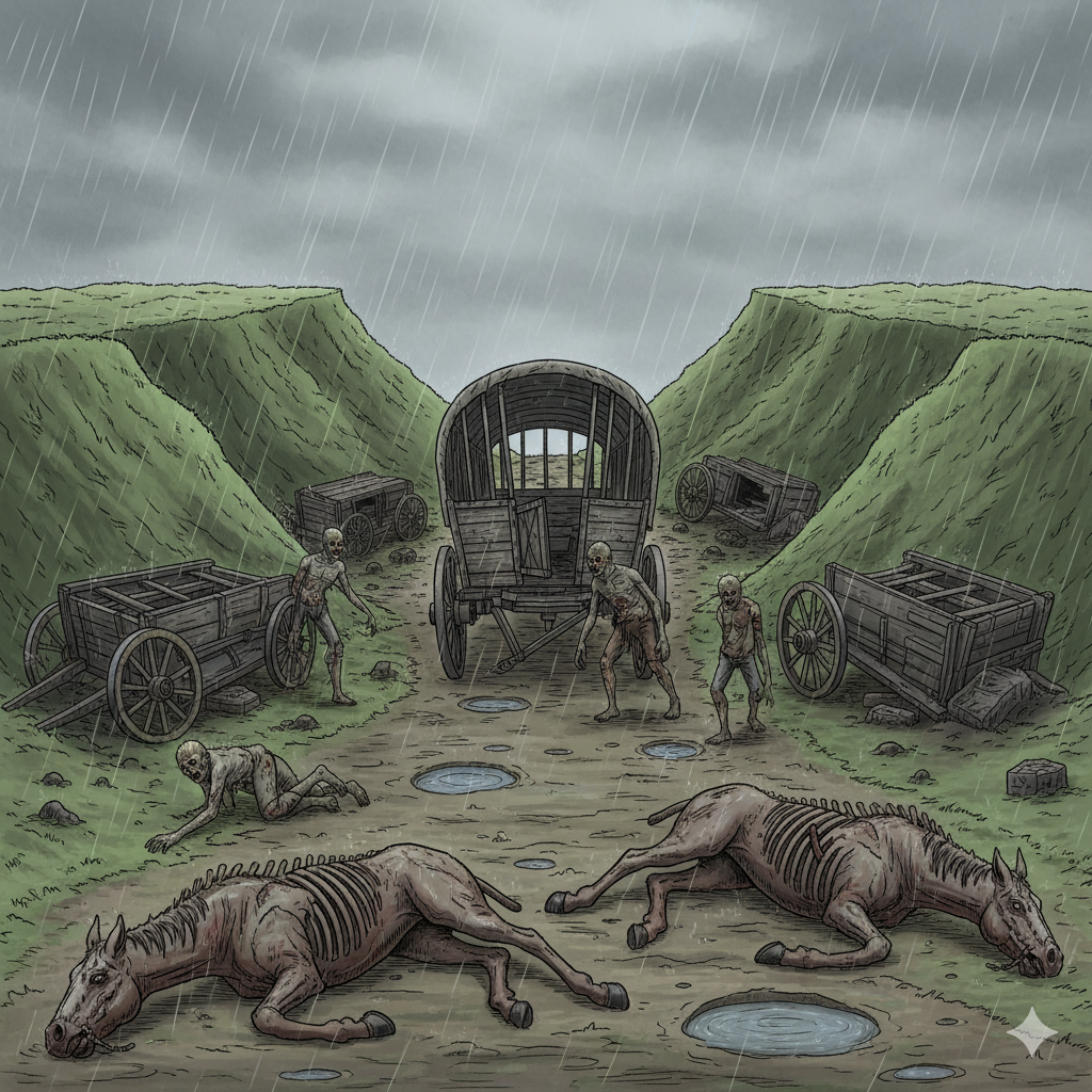 Creek decided to sneak forward, while Volu and Zodack stayed within earshot. When Creek reached the north ridge, he could clearly see the ruined wagons and dead animals, what he did not see was any bodies. It appeared that there was no sign of the caravanners anywhere. Creek motioned his friends to come up to the ridge as he climbed it to get a better look. From above he got a better look at the wreckage. There were indeed four bodies strewn amid the wreckage, but there should have been many more. A barred wagon clearly for prisoners was also visible, it's door swinging open in the wind. Just as Zodak and Volu reached the foot of the ridge the bodies in the wreckage rose up and started to shamble toward them.