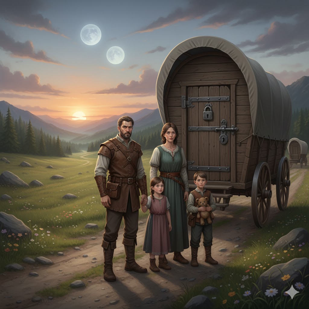 The Entwhistle Family has signed on to Jerek Stonehand's caravan as a safe way to get to Hilltown. Arthur Entwhistle is a young merchant who is 30 years old. He plans to open a general store in Hilltown and has brought his wife Liza age 25 and his children, Arthur Jr. age 7 and this daughter Rebecca age 9 along. The children stay in the wagon with their mother most of the time only coming out for meals. The back of their wagon is always locked and no one in the caravan has seen what is inside.