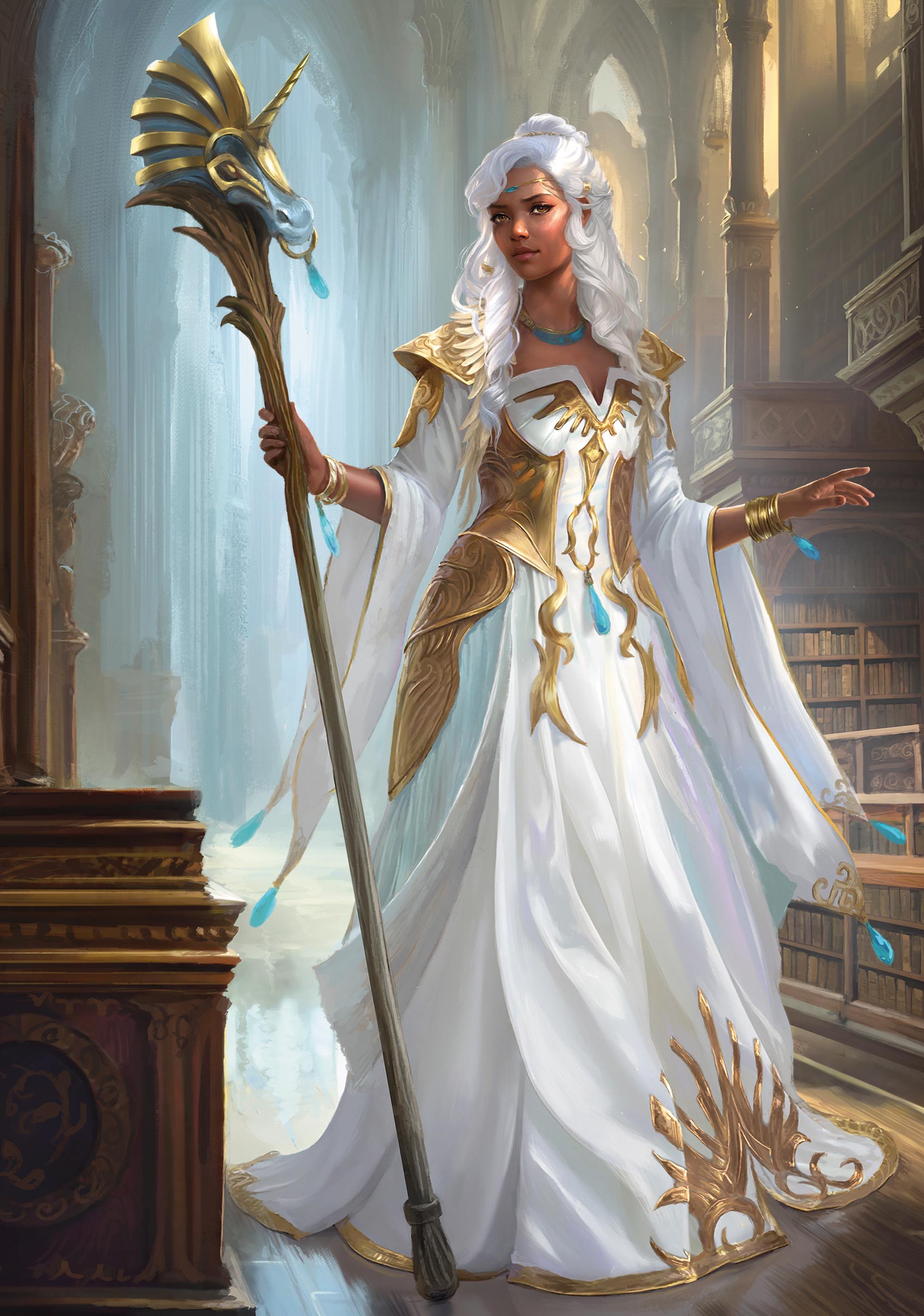 Lady Alustriel Silverhand, called the Shining Lady, has been an influential wizard and proponent of good across Toril for centuries. Alustriel is one of the Seven Sisters—immortal daughters of Mystra, a god of magic. The divine energy Mystra passed to Alustriel grants Alustriel incredible power over arcane magic. Alustriel’s youthful appearance as a human woman with silver hair gives no hint of her supernaturally extended life span. She typically wears long robes and wields a unicorn-headed staff, her Staff of Silverymoon.