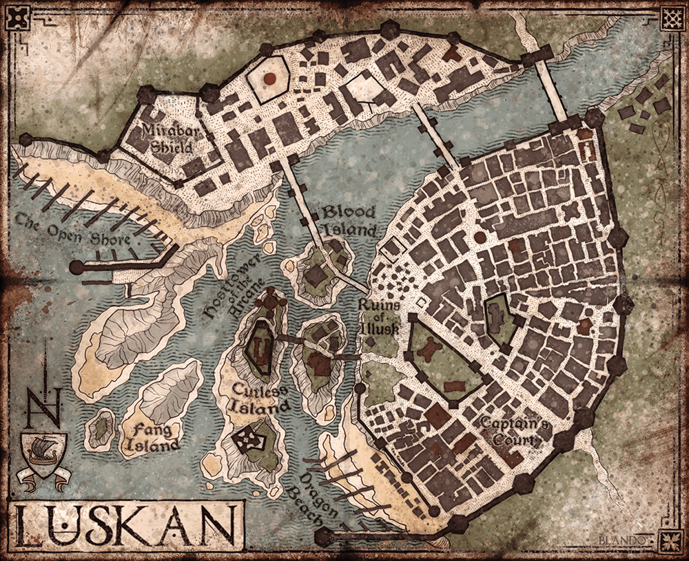 Anyone who goes to Luskan should know about its ruling Ships and The Arcane Brotherhood. The Ships of Luskan have been described as bands of pirates, but that characterization misses how deeply ingrained the Ships are to the society of Luskan and the mentality of its citizens. Attack a Ship member and you might incur not just the wrath of the Ship, but of much of the city as well. As for the Arcane Brotherhood, one member of it may or may not come to another’s aid, but know that each of these egotistical mages is eager to prove his or her magical prowess, and none can afford to show weakness before the folk of Luskan. Luskan, the City of Sails, spans the icy River Mirar, which tumbles from the Spine of the World, races past Mirabar, and then plunges toward the sea. The swift river has cut deep here, and Luskan rests atop two escarpments on either side, with sheer, forty-foot bluffs of gray stone rising above the water. Around the city’s perimeter, thick stone walls with squat towers provide defense. The southern gate, called the Twin Teeth, boasts the most impressive towers, standing twice as tall as the city walls, and bedecked with crenellations and arrow slits enough for numerous defenders, in a show of strength toward the southern approach.