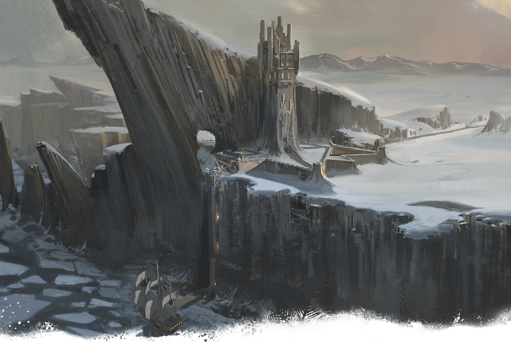 Revel’s End is a panopticon, a prison configured in such a way that the activities of the prisoners can be closely monitored from a central location. Situated on the frigid, misty coast of the Sea of Moving Ice, the prison is a single-story structure topped with battlements. Rising from the core of the panopticon is a tower that holds the prison’s administrative offices and guard barracks. Both the prison and the tower are carved out of a tall, blade-shaped rock that rises high above the sea cliffs. This rock, called the Windbreak, shields the tower against the brutal winds that sweep down from the Reghed Glacier. One can approach Revel’s End by land, sea, or air. A pier allows prisoners to be taken from ships up an elevator to the prison, and a mooring dock at the top of the tower allows prisoners to be delivered by airship as well. Revel’s End is controlled by The Lords' Alliance. To be imprisoned in Revel’s End, one must have committed a serious crime against one or more members of the alliance and been sentenced to a lengthy period of incarceration (typically a year or more). Moreover, the offender must have political connections that make incarceration in another facility less dependable. Captured spies, for example, are often brought here to cool their heels.