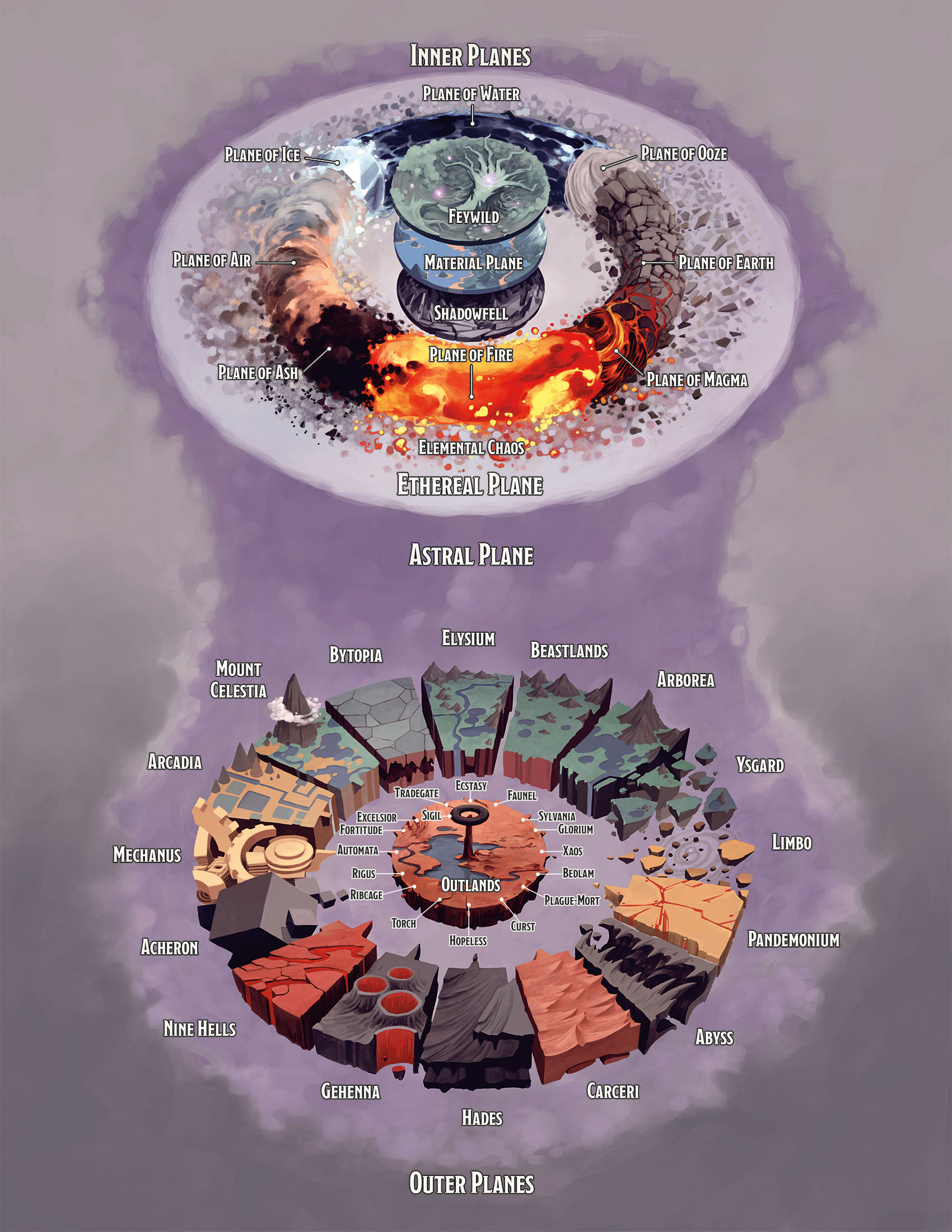 - Shadowfell and Feywild (parallel reflections of the Material Plane)