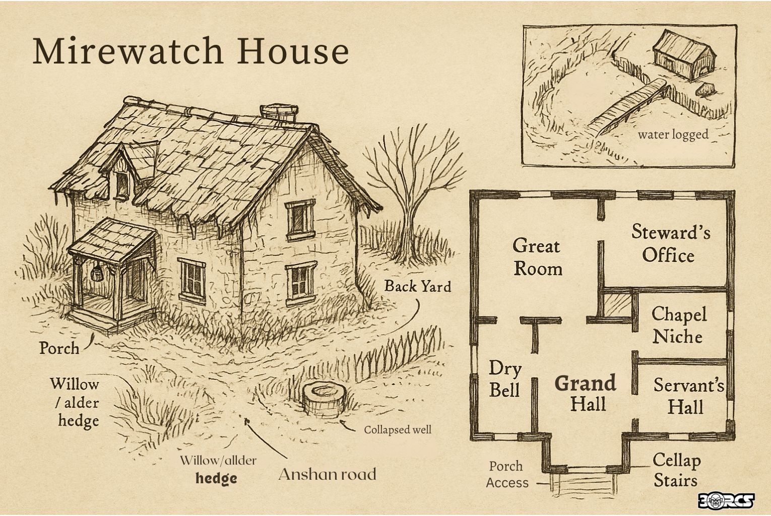 - Mirewatch House & meadows: Part of Asbury’s demesne formerly entrusted to the Ashford family as life tenancy / stewardship, now effectively escheated (reverted) due to failure of service and abandonment.
