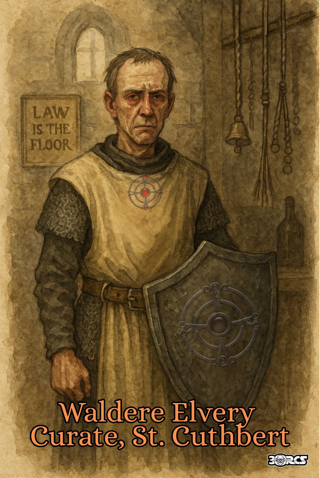 - “Bottle under the Vestry” — If PCs notice Waldere slipping, they can cover for him at vespers (two PCs read; one leads a hymn success preserves parish morale and unlocks a once/week free sanctify.