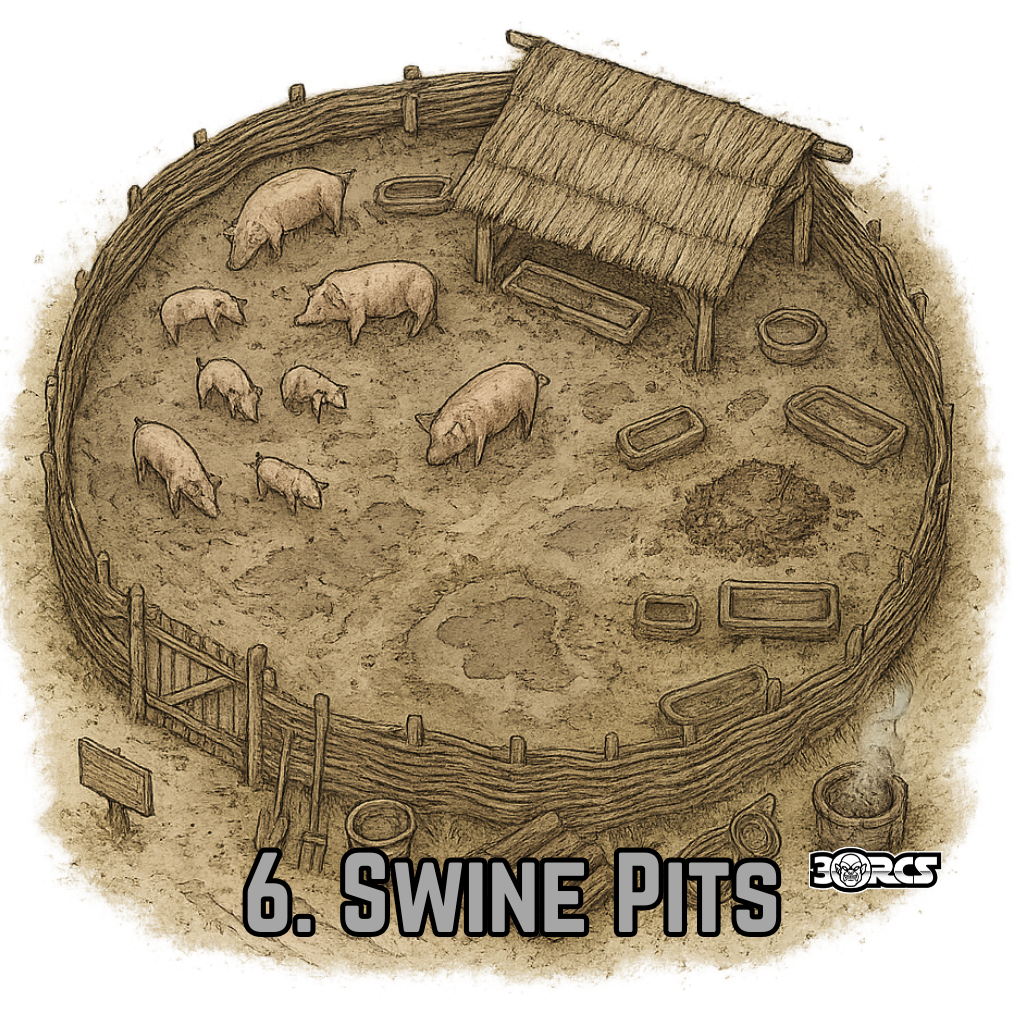 - Main Pit: Chest-deep wallow ringed by plank fencing (counts as difficult terrain; Strength DC 10 to clamber the fence quickly).