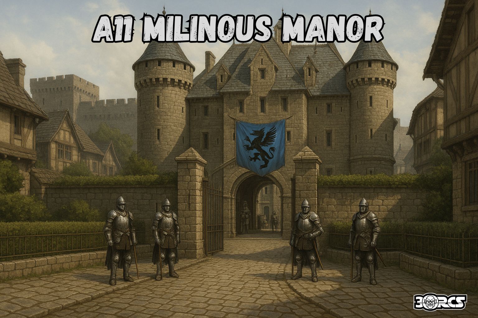 At the terminus of Greyfist Road, where the lane climbs toward the outer walls of Castle Greyfist, stands Milinous Manor—half fortress, half noble house, and all hard-edged martial pride. Its thick stone curtain, arrow slits, and plate-armored sentries proclaim Lord Simon Milinous’s belief that nobility is earned and kept by the sword, not by silk.