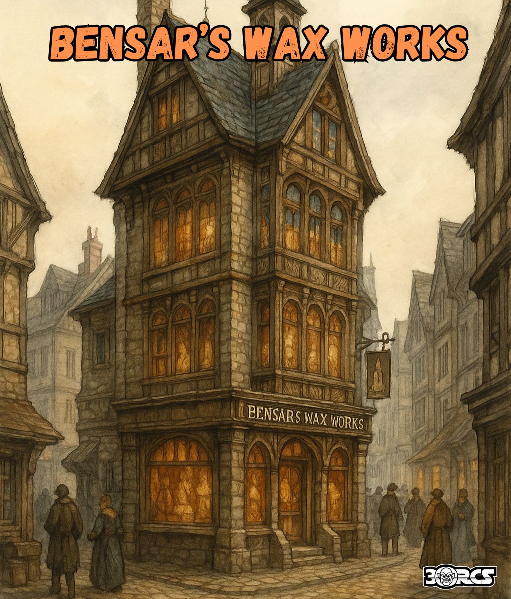 Over the door, a painted sign reads BENSAR’S WAX WORKS in curling letters, and the smell of hot wax and honey drifts out as you climb the short stone steps. Shadowy figures—some men, some beasts, one that might be a dragon—stand motionless beyond the glass, their forms ghosted in pale, glistening wax.