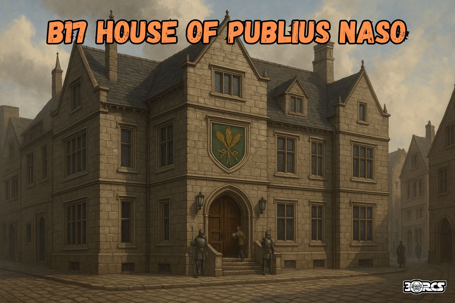 - Structure: A tall, two-story manor with a steeply peaked slate roof, flanked by narrow chimneys and ornamented in the contemporary Greyhawk City style—lots of clean lines, tall mullioned windows, and understated stone carvings of laurel wreaths and ploughs. B17 House of Publius Naso