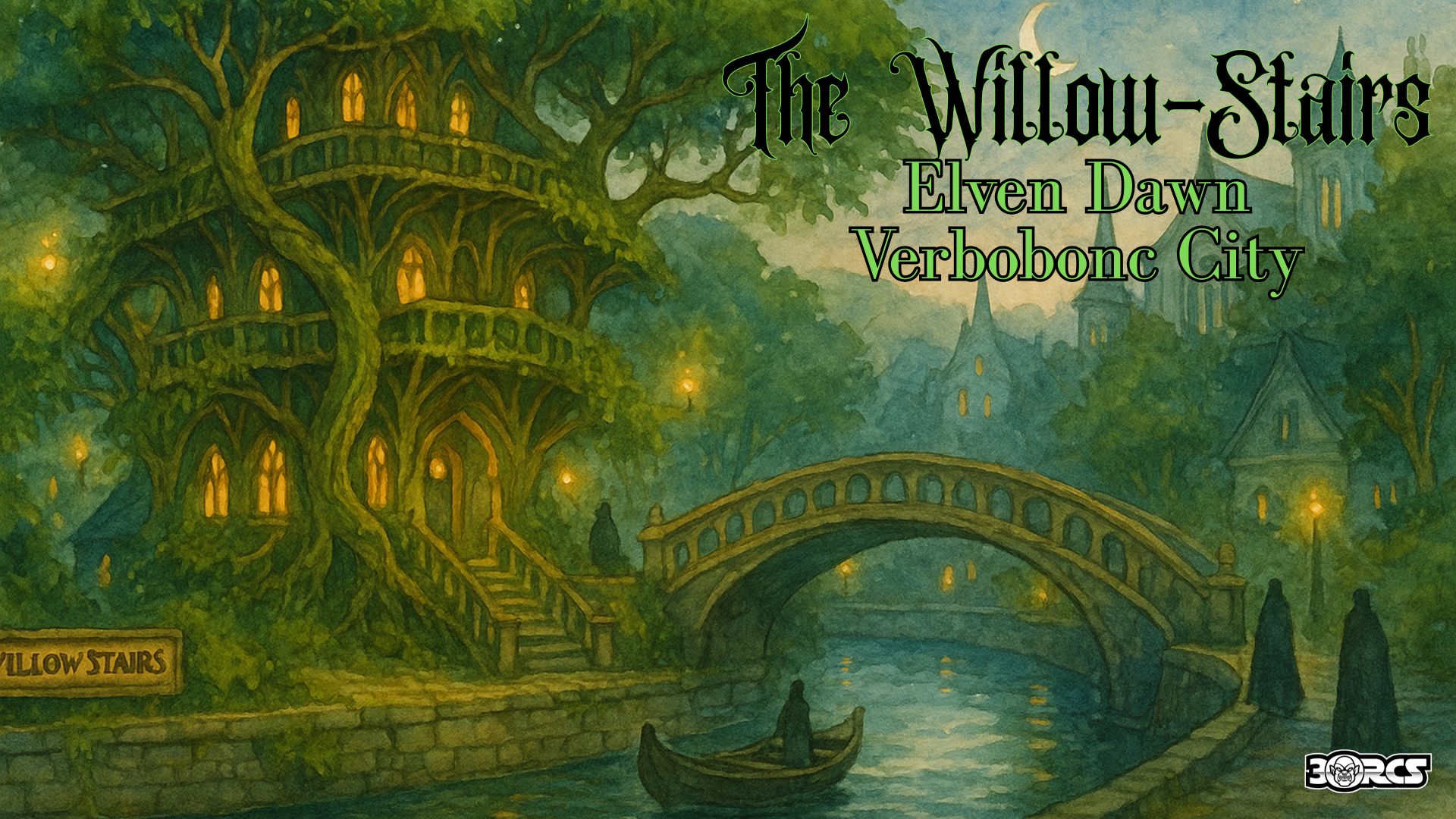 The townhouse is “grown” rather than built: stacked galleries of willow-framed walks, stair-tubes of interlaced boughs, and rooms paneled in living bark. Its plan echoes older Verbobonc elven work—narrow passages, airy halls, and spiraling stair without banisters—married to the enclave’s ipt-house tradition. A vine-screened court opens to the canal; a moon-bridge of pale wood spans to a small lecture arbor across the water.