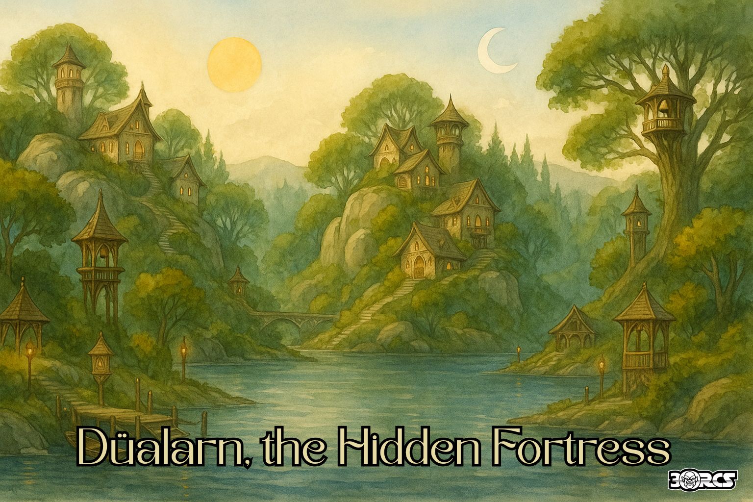 At first glance Düalarn is a tranquil ring of boathouses, hill-villas, and vine-draped stairs around Lake Nuralin. Beneath that placid surface lies the Sherendyl answer to hard centuries: a honeycomb of subterranean galleries, granaries, armories, and sanctuaries interlinked under the granite hillocks that encircle the water. The village drills like a barracks, plans like a siege quarter, and hosts guests like an embassy. If war or calamity comes, Düalarn can shelter the entire clan and hundreds more; until then, it keeps its strength politely out of sight.