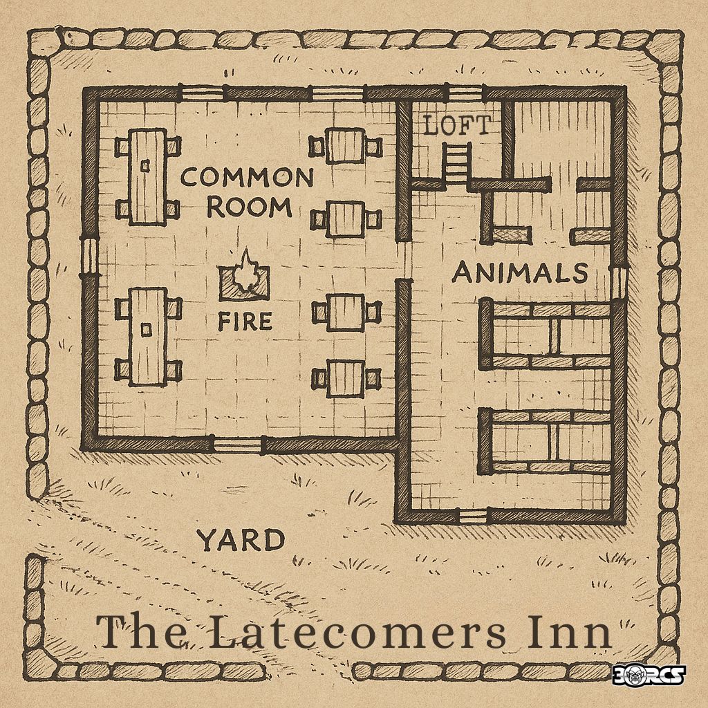 Nestled just outside the East (High) Gate of Verbobonc, along the bustling High Road, lies a unique and rustic tavern known as The Latecomers Inn. At first glance, it may seem merely a well-kept barn, but behind its sandstone brick and wood board facade, it harbors a lively and warm atmosphere that welcomes all manner of travelers.