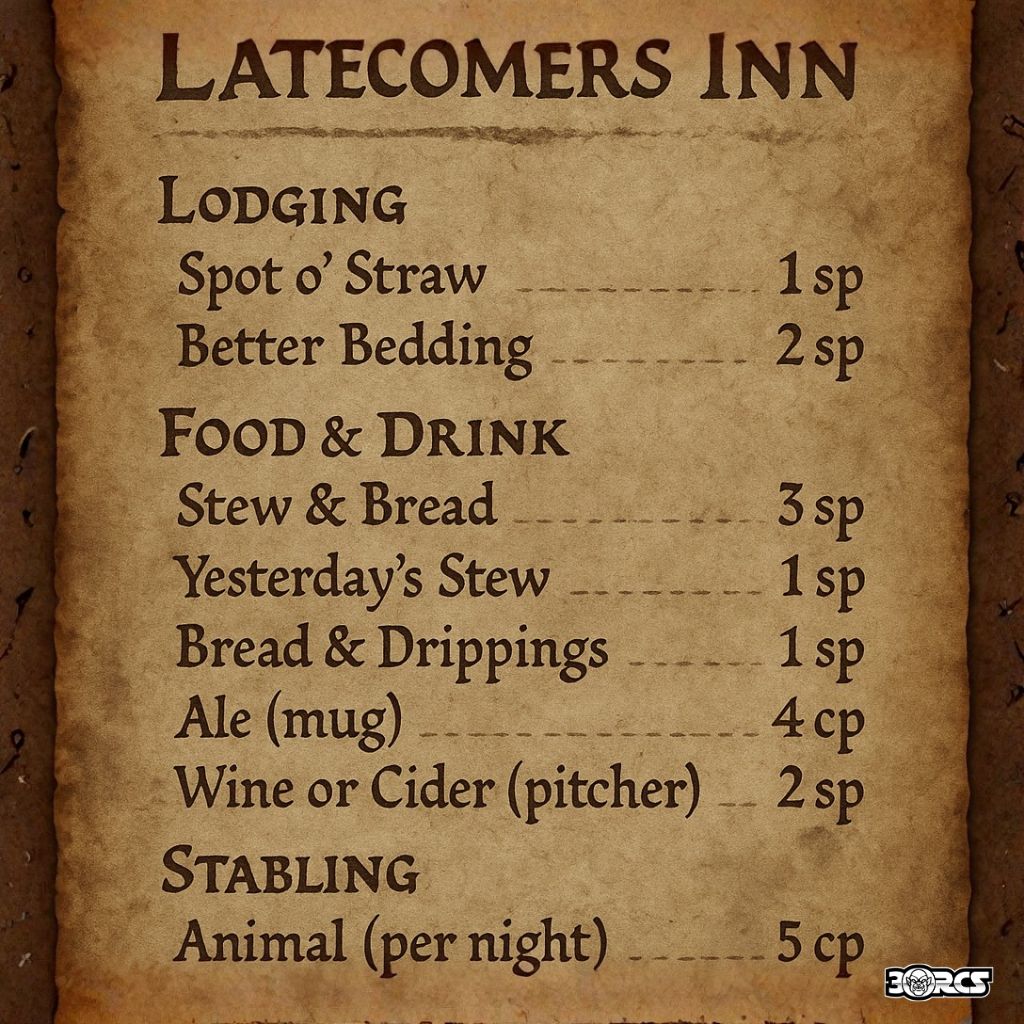 - Stabling / Yard Space: 5 cp per animal per night for access to fodder, water, and a straw bed.