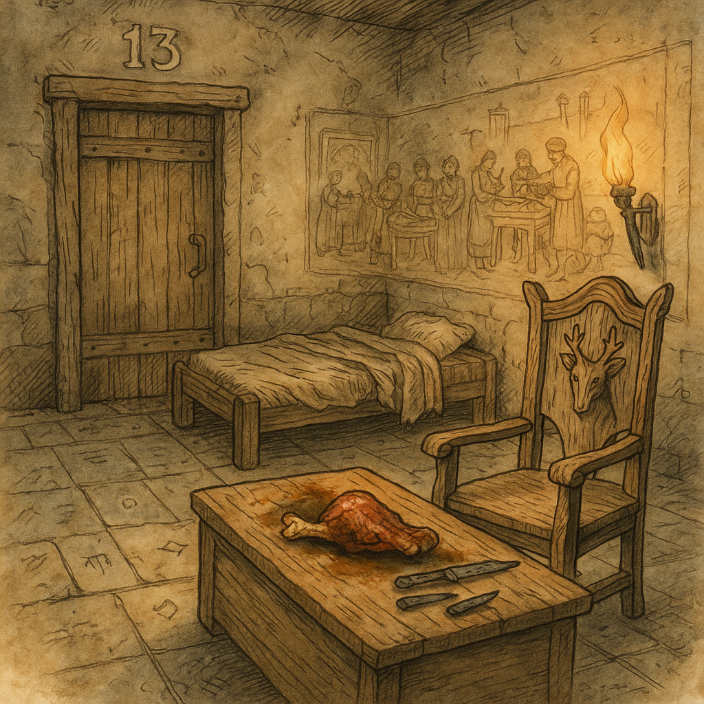 - If no earlier combat: Brughan sits in the stag chair, gnawing a gamy haunch, chest pulled up as a table.