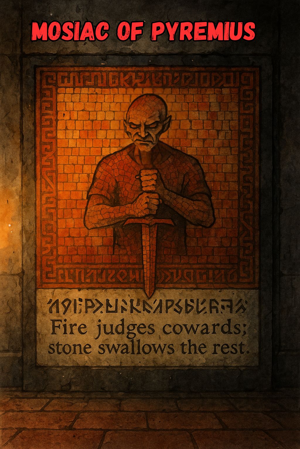- Iconography (Religion/History DC 12): Pyremius’s down-pointed blade marks a place of terror-judgment; the far relief (jermlaine-headed tyrant) is an ancient Suel intimidation piece used to cow captives.