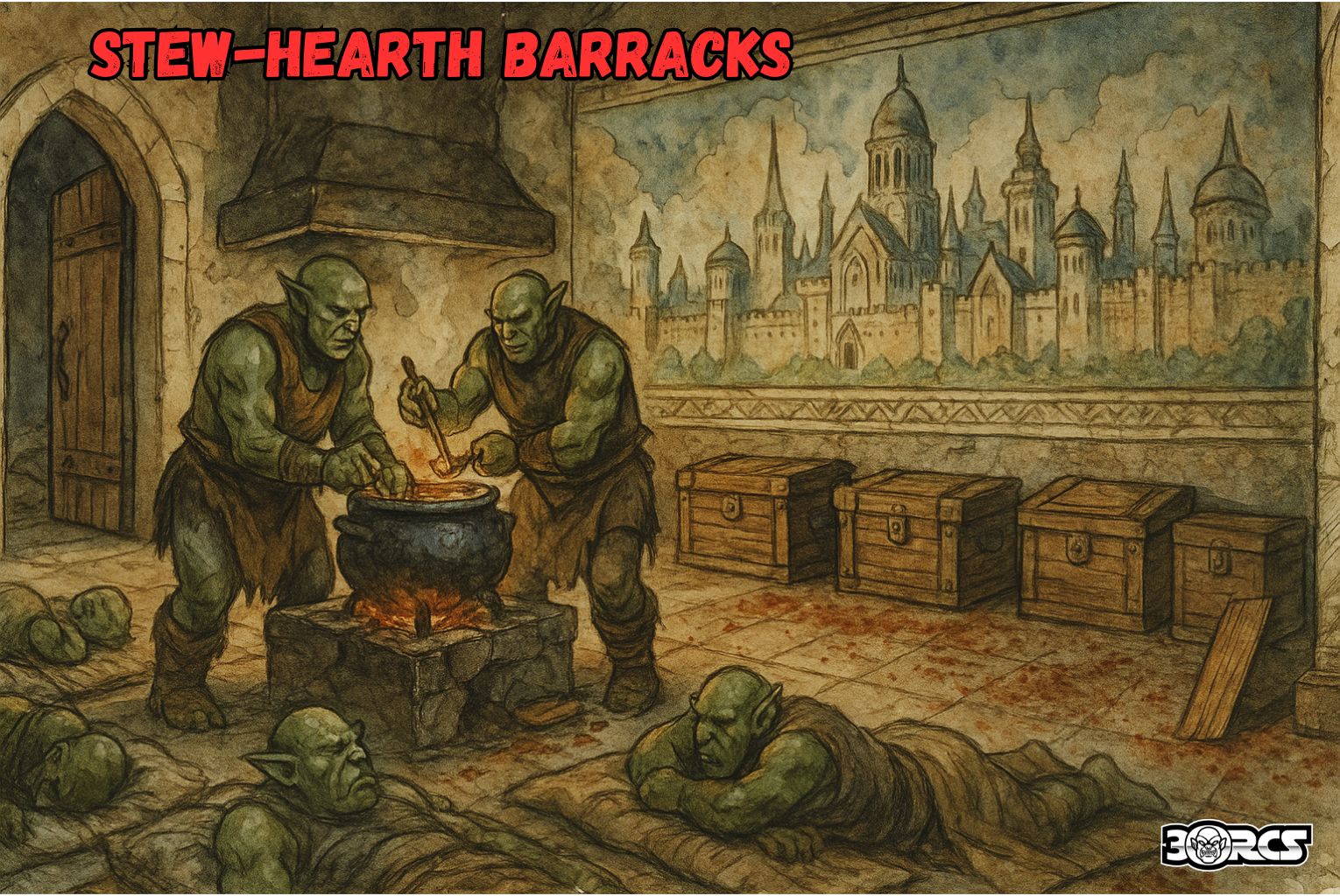 Former kitchen/mess converted into an orc barracks. Both doors are spiked open for fast response. Eight orcs are assigned here—six asleep on wall-lined pallets, two awake cooking at the blackened stove. A long Suel mosaic of a fantastical walled city runs the length of one wall (useful lore cue). Five battered chests sit along the east wall: common kit, bones and leather scraps, a small crate of coin, a chest with acid/rust traces (echoing 5A), and one holding Thuldon Rockspitter’s dwarf-sized chain mail. Any loud noise or a horn/howl wakes the room; one orc will try to sprint to Room 4 to blow the bray-horn while the rest form a line using kitchen tables as half cover. This room will reinforce any nearby fight on your response clock.