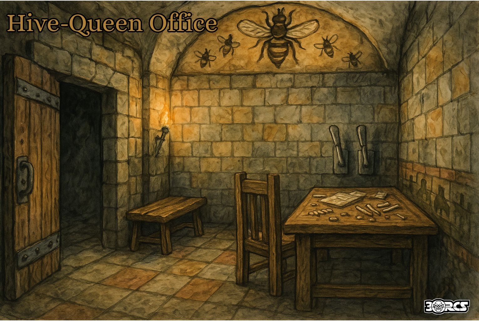 Once the administrative office of the Suel priests, now a control post wedged between barracks. An open, iron-bound oak door looks in on a tiled chamber with a ceiling mosaic of a queen bee and six workers—the mark of Bralm, Hive Goddess of industry and order . A stout desk, matching chair, and crude orc bench face the wall where two new steel levers are set into stone; they operate the paired portcullises guarding the descent to the crypt level. One Howling Moon elite (Krang) is always on duty here to command responses; with the door left open, he notices anyone passing unless invisibility or total cover is used.
