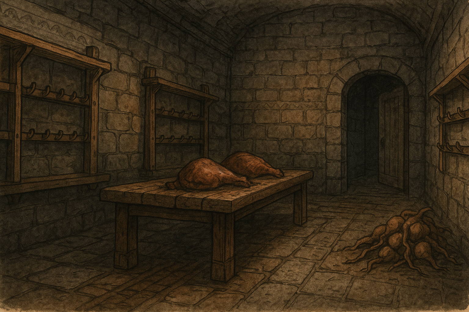 - Drag marks across the floor. A heavy rectangular object was dragged from north wall to south recently. DC 12 Investigation identifies the path and embedded grit (coarse crate bottom). DC 13 Survival tracks it through the kitchen door—likely looted stores or a butcher’s chest. There’s no hidden hatch here; the marks are exactly what they look like.