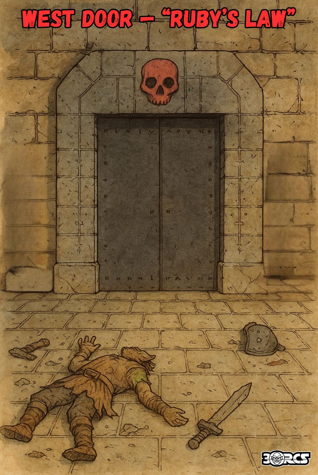 - Positions tell a story: one corpse slumped at the bowl (hands locked on rim), another sprawled between mis-faced statues, a third collapsed near the west door with fingers outstretched as if “holding still.” (Investigation DC 12 connects these to sealing attempts.)