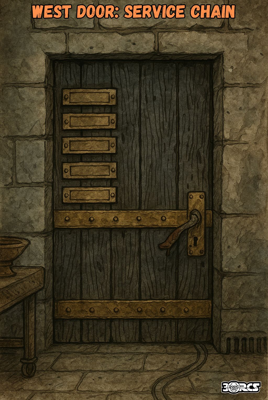 A workman’s door squats in the west wall, low and strong. Six blank name-plates march down its face; a smear of dried resin darkens the handle.