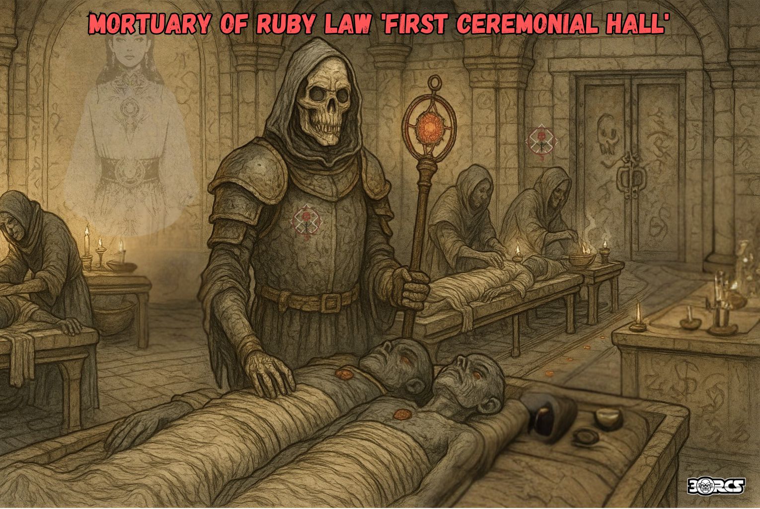 - Keeper of Ruby Law. If characters observe funerary rites (wash/incense/name on a six-count) or speak the watch-prayer in cadence, the Custodian is indifferent and does not attack unless attacked. While a creature is keeping rite this round, the Custodian and Ruby Ghouls have disadvantage on attacks against that creature.