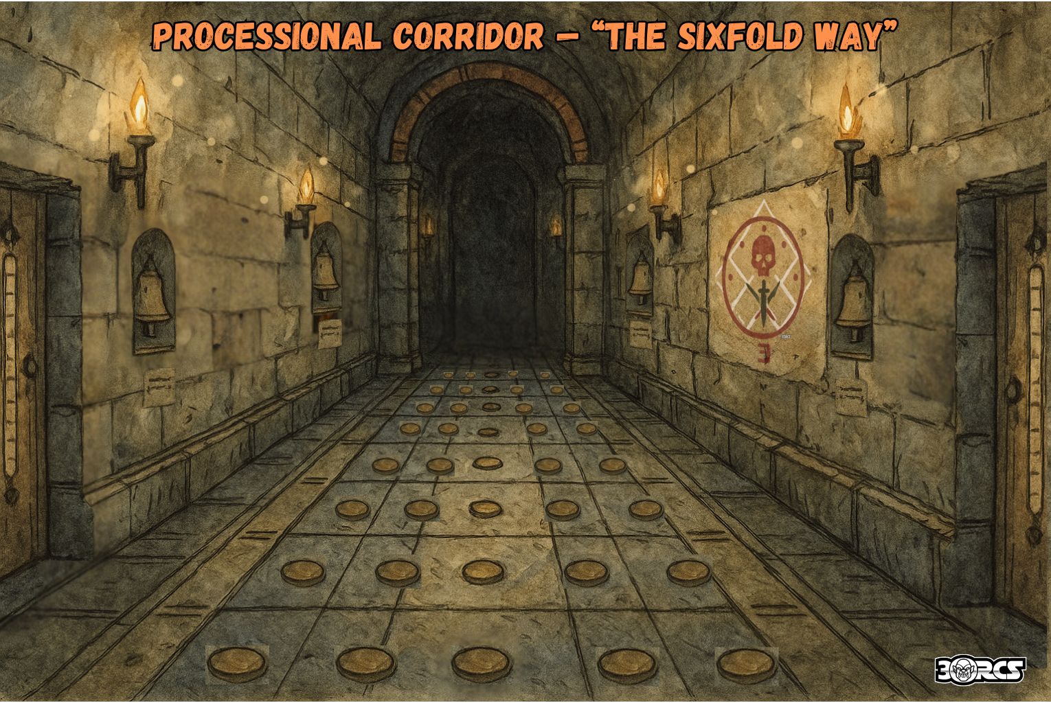 - Six is the grammar: notched tiles every 6th; six brass Procession studs along the centerline; six cracked bells in wall niches.