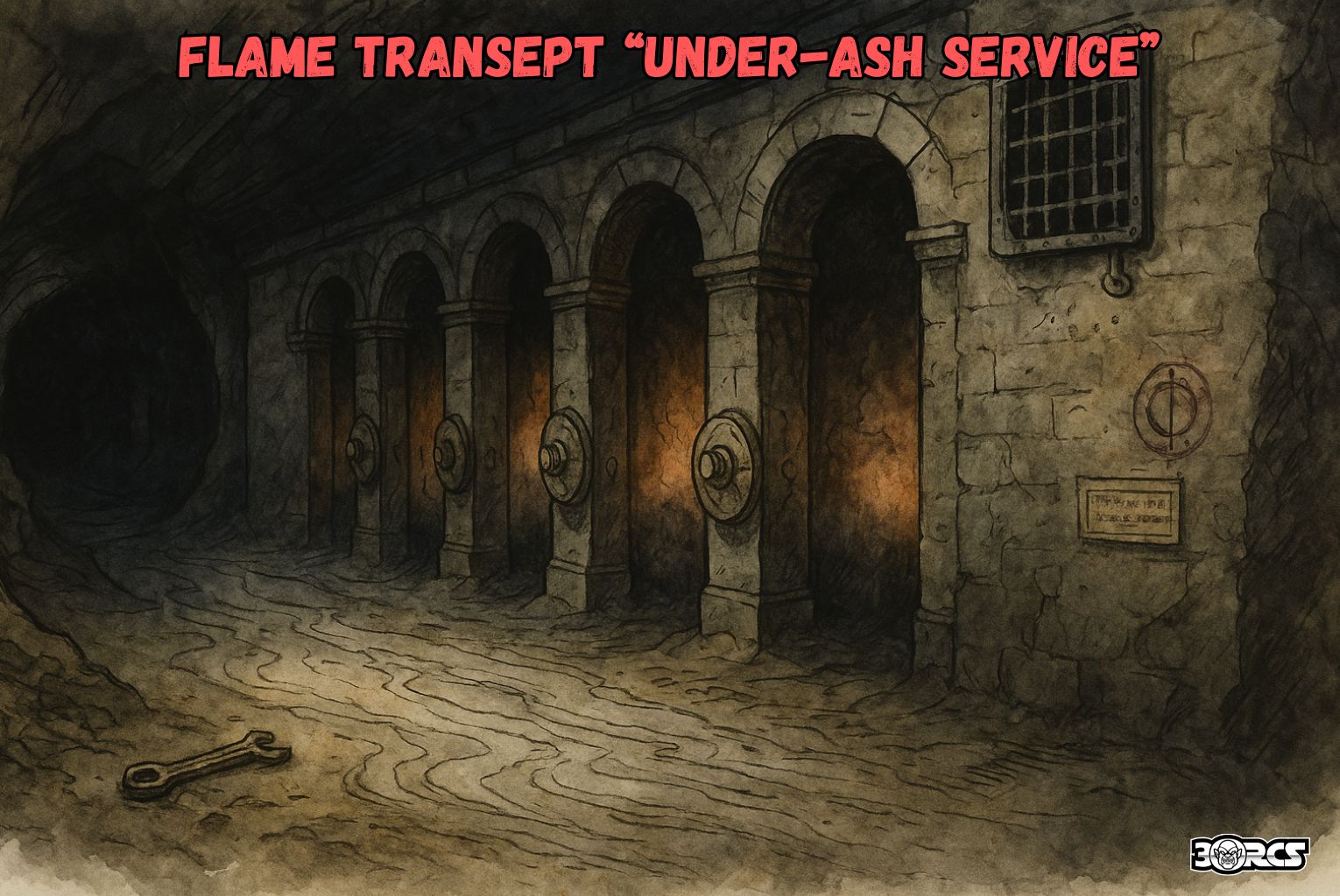 Ancient Pyremian service run that once moved draft and ash beneath the temple. The Mortarch probed it, then left it mostly intact to keep the mortuary above temperate. This hall is hot, quiet, and breathes on a six-count—the same grammar as the rest of the crypts, but expressed as heat and draft.