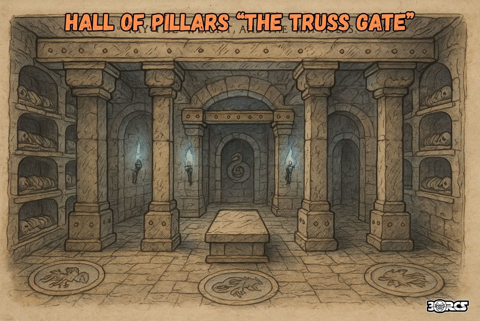 - Floor plates: a round plate before each arch engraved with a beast knot (boar = south, eagle = west, serpent = north—Suel totems reinterpreted).