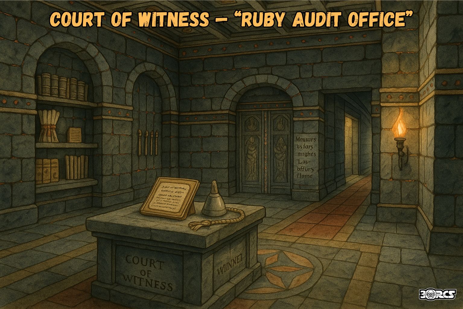 Inscription (Old Suloise): “Witness, then proceed.” - Ledger Niches (north wall): Pigeonholes with bone tally sticks, wax tablets, a small Wee Jas ribbon-seal, and a maplet slate of adjacent rooms (Crossroads, Vault, Gods’ Door).