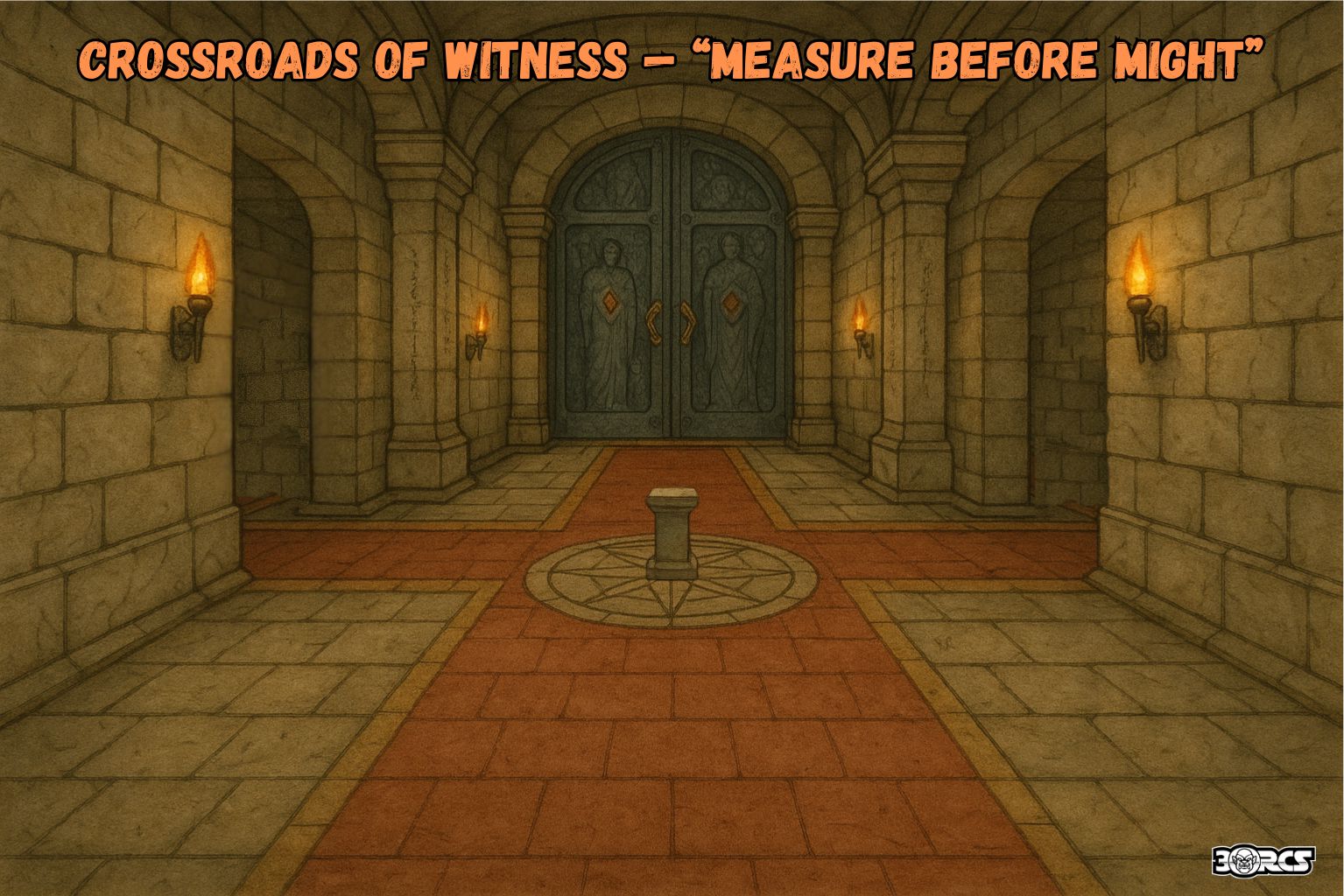 - Center lintel (shared): “Measure before might; Law before flame.”