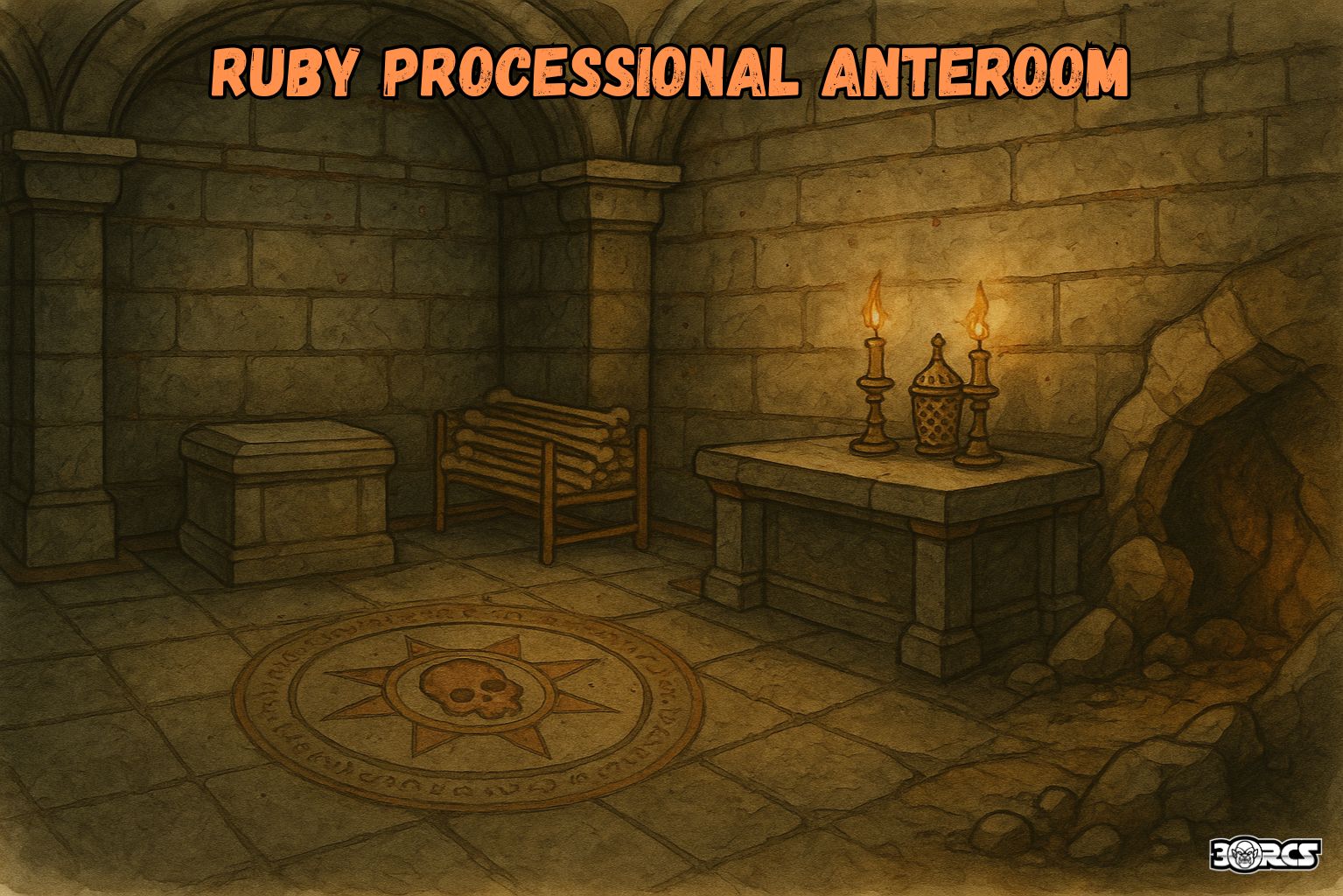 - On Attention ≥ 2 while the party remains here: a Ruby Ghoul and 1d2 Ruby Zombies nose in from the Great Hall side within 1d4 rounds, curious about the bell.