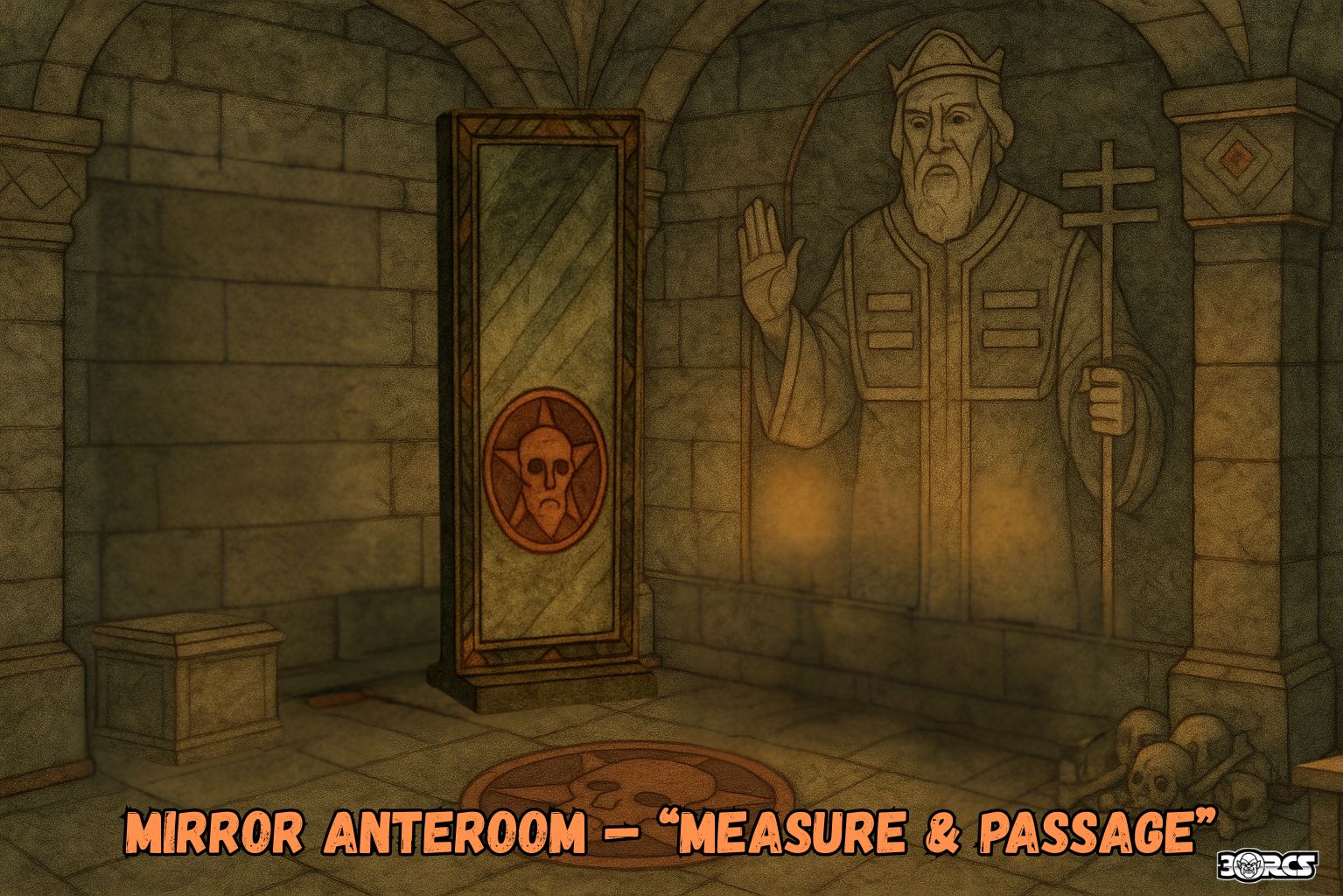 - Function: Second processional prep cell. Adds a Suel full-length mirror (NW corner) and a hidden mural-door centered on the north wall that leads to a short service slip (10′, 5′-wide) and the backside of another secret door (keyed elsewhere).