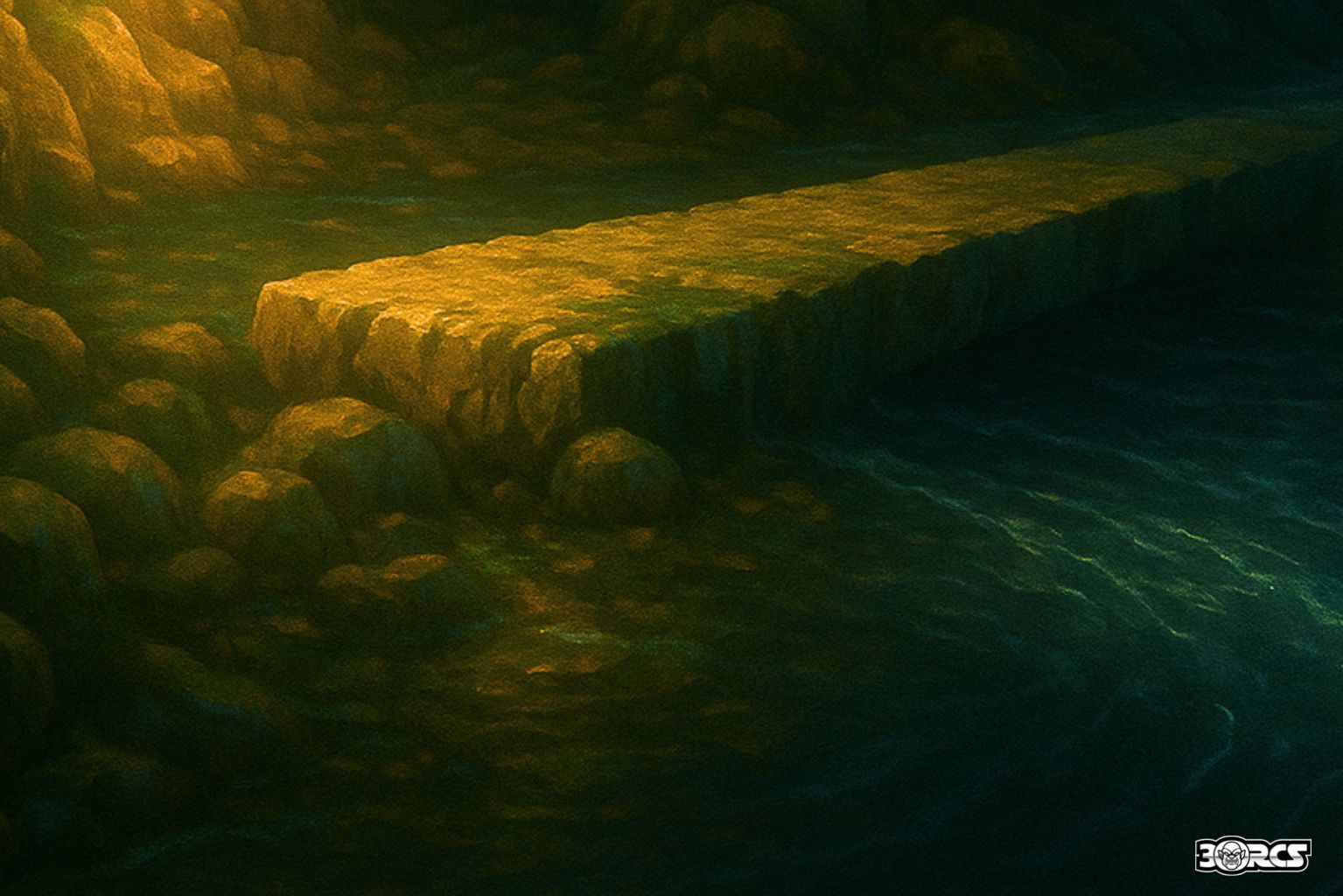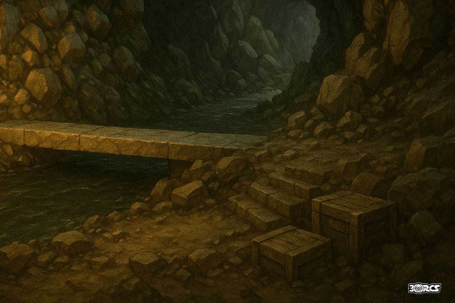 - Buried route: A narrow crawl under fallen timbers (Squeezing) leads 15 ft east and re-emerges on the river’s far bank (one-way unless cleared; Athletics DC 12 to shift a beam for two-way use).