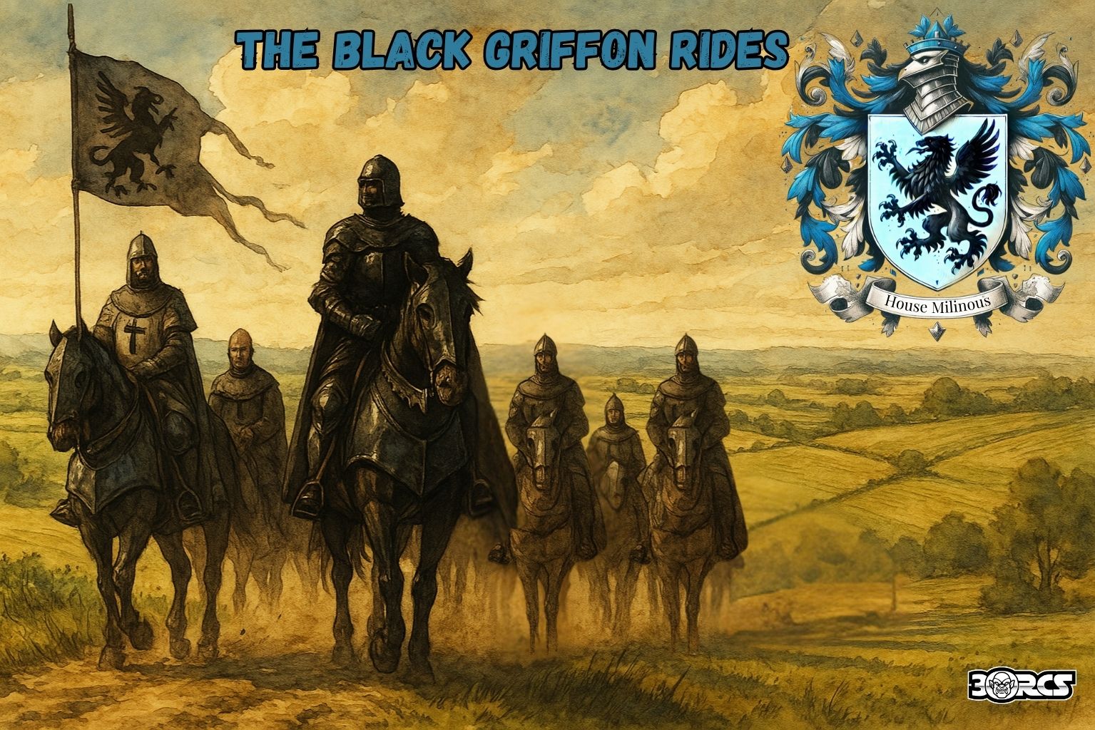 Behind them ride a dozen retainers in chain, shields and tabards all marked with the black griffon, crossbows already to shoulder.