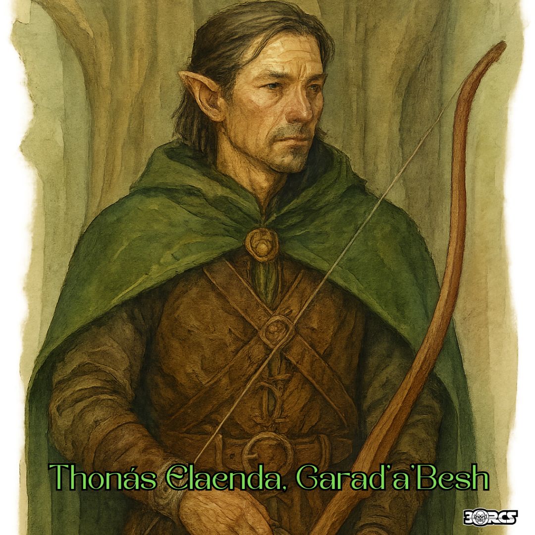 A veteran pathfinder from the Elaenda (Greenheart) tribe—one of Meldarin’s smaller kin-groups famed for arbormancy and a higher-than-usual number of half-elves—Thonás Elaenda rose from ranger captain to Lon’Törl three decades ago on the strength of fiery speeches calling the clans to reassert stewardship over the Gnarley. In 573 CY he succeeded Gilathadar Telva as Garad’a’Besh (Binder of Oaths) and now walks a careful line between Verbobonc-leaning pragmatists and those urging a renewed alignment with Celene, Faerie Kingdom of.