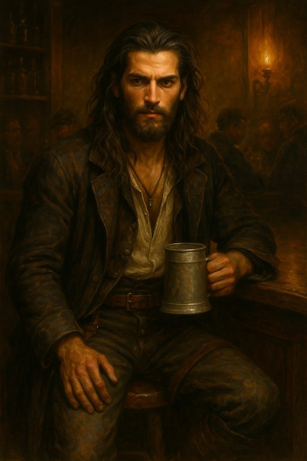 His dark brown hair reaches his hips, often tied loosely or left unbound, and he wears it with the unthinking pride of one who has carried it for centuries. His eyes are a muted bronze-green — calm, but haunted.