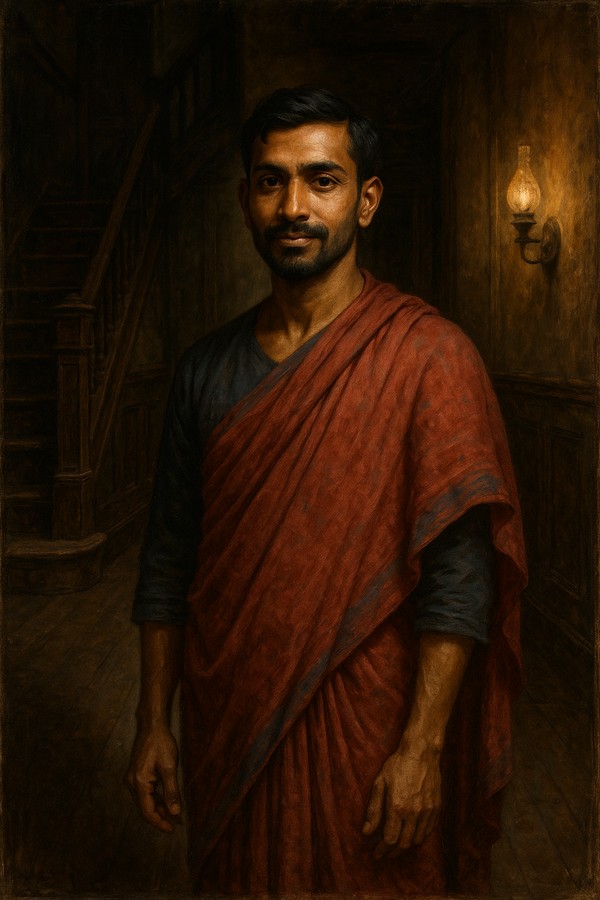 He dresses plainly but precisely — dark wool coats in winter, linen shirts in summer, sleeves rolled to the forearm as if he still expects to take a rope in hand. Within the private comfort of The Mooring & Mast, however, he often exchanges these for a simple cotton sari wrapped in the Bengali style — a quiet nod to his homeland and a preference for ease rather than display. There is a quiet elegance to him, a composure that makes noise unnecessary.